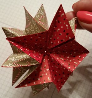 J\’ai choisi de la concevoir en format mini, mais il est tout à fait possible de modifier les dimensions ; l\’étoile n\’en sera que plus grande. Par contre, dans cette hypothèse, il faudra partir sur 6 carrés de papier à assembler, plutôt que 5.
