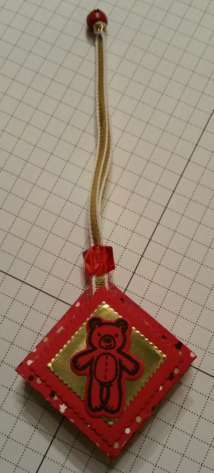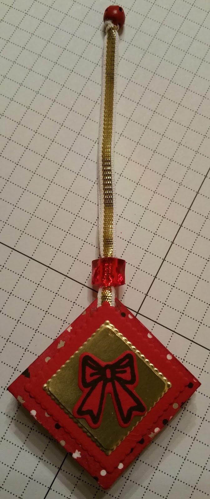 Et pour mater les extérieurs de mon étoile, j\’ai découpé 4 carrés à l\’aide de la matrice de découpes \ »Pyramides de carrés\ », réf. 141708 du catalogue annuel 2016/2017, page 193. J\’ai utilisé les deux plus petits carrés festonnés. Je me suis servi du tout petit pour découper deux morceaux dans la chute de feuilles métallisées or (réf. 132622), et avec le second, j\’ai découpé deux morceaux dans la chute de papier cartonné rouge-rouge (réf. 141982).