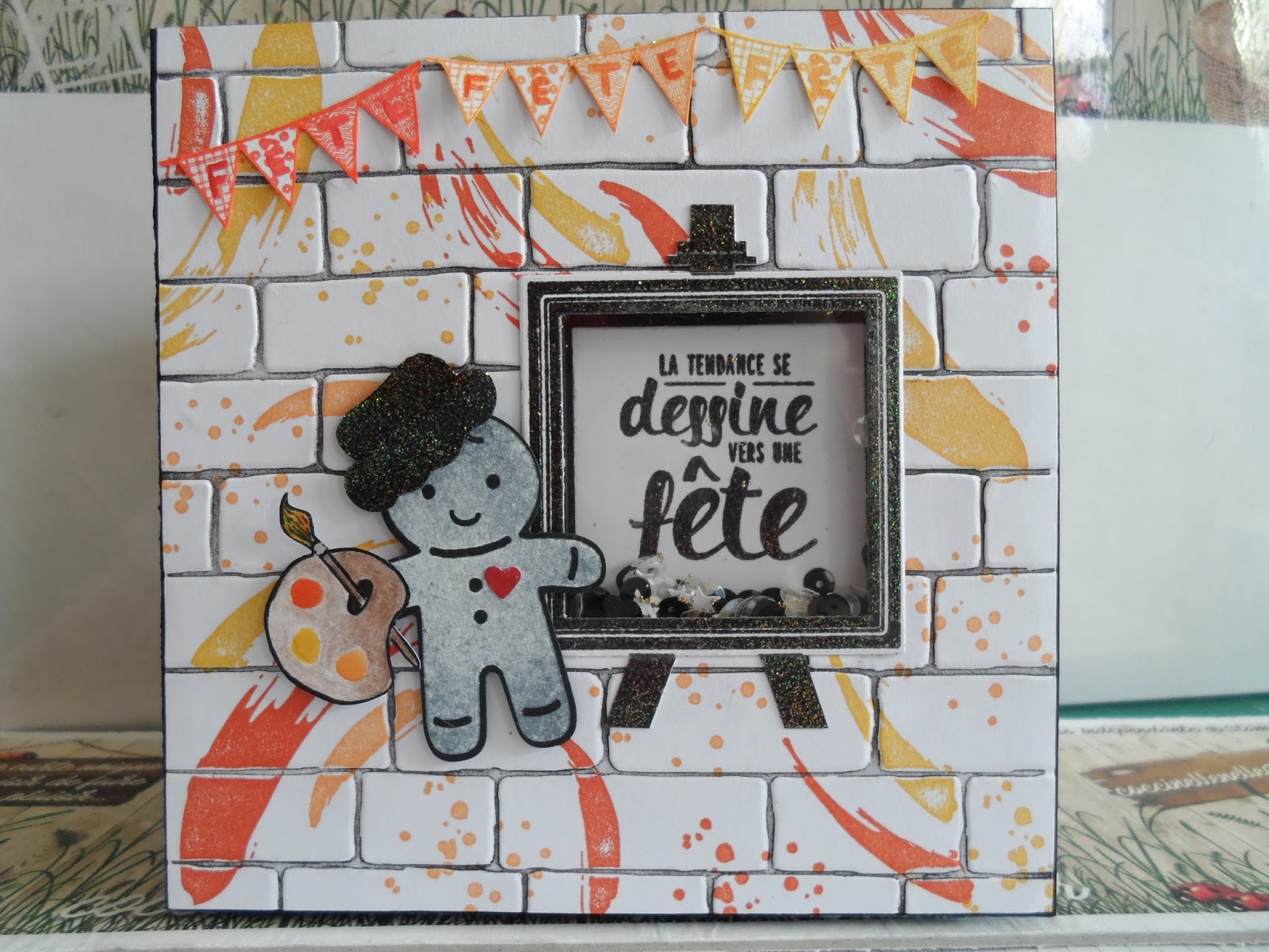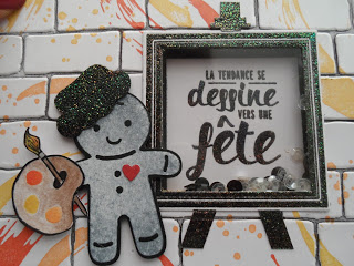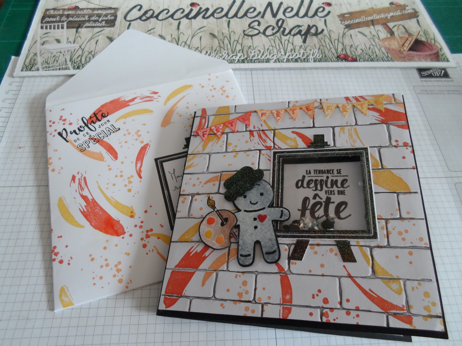 Je l\’ai réalisée à l\’occasion d\’un anniversaire pour une personne qui aime les chats, avec le set de tampons \ »Palette d\’artiste\ » que j\’adore, et comme les fêtes de Noël ne sont pas loin, l\’artiste de ma carte sera notre petit bonhomme en pain d\’épices du set de tampons \ »Emporte-pièce de Noël\ ».