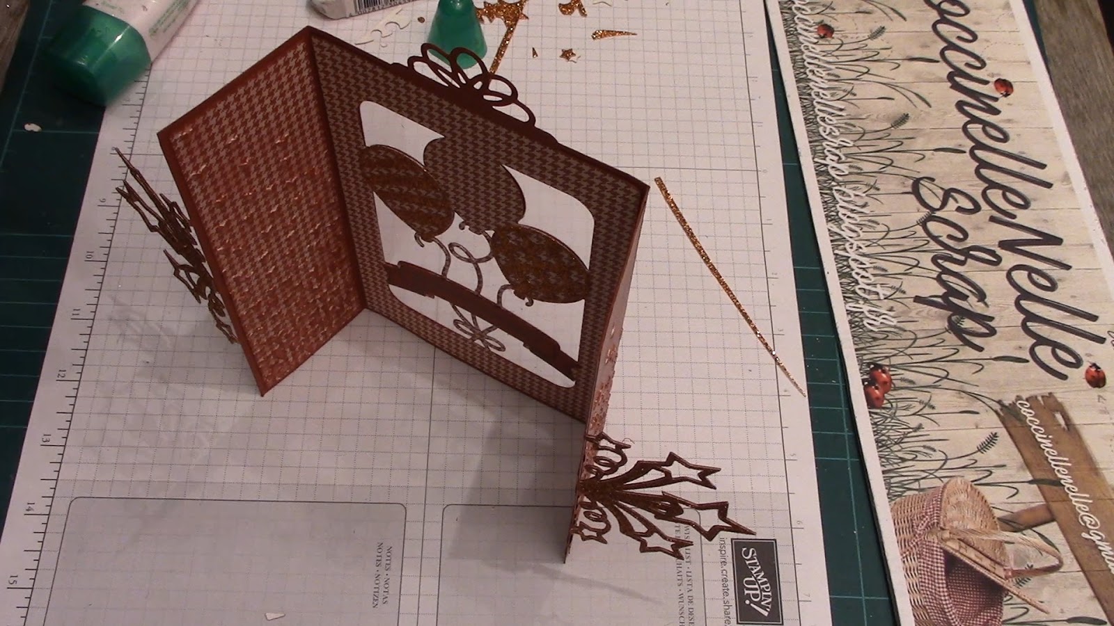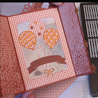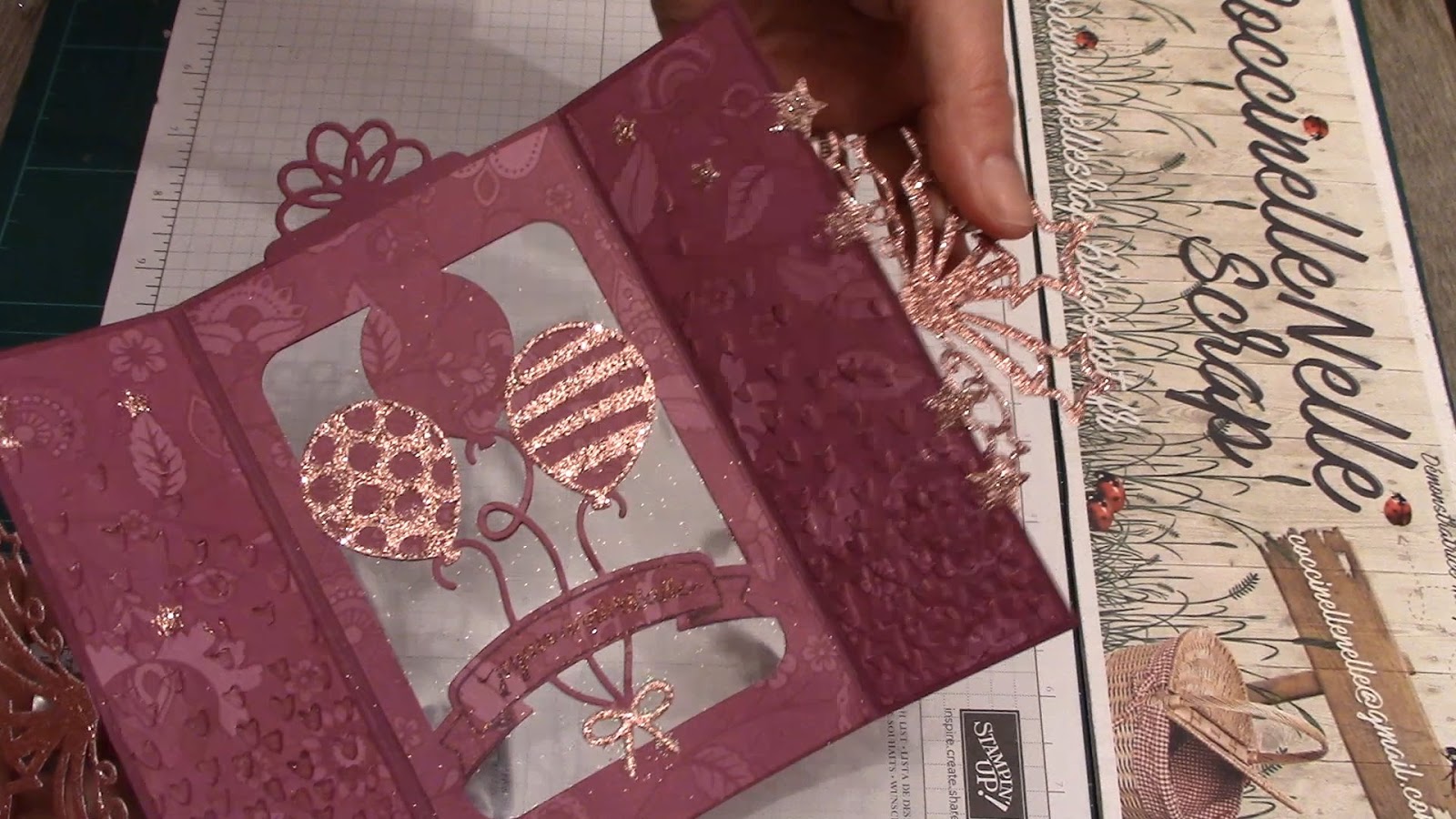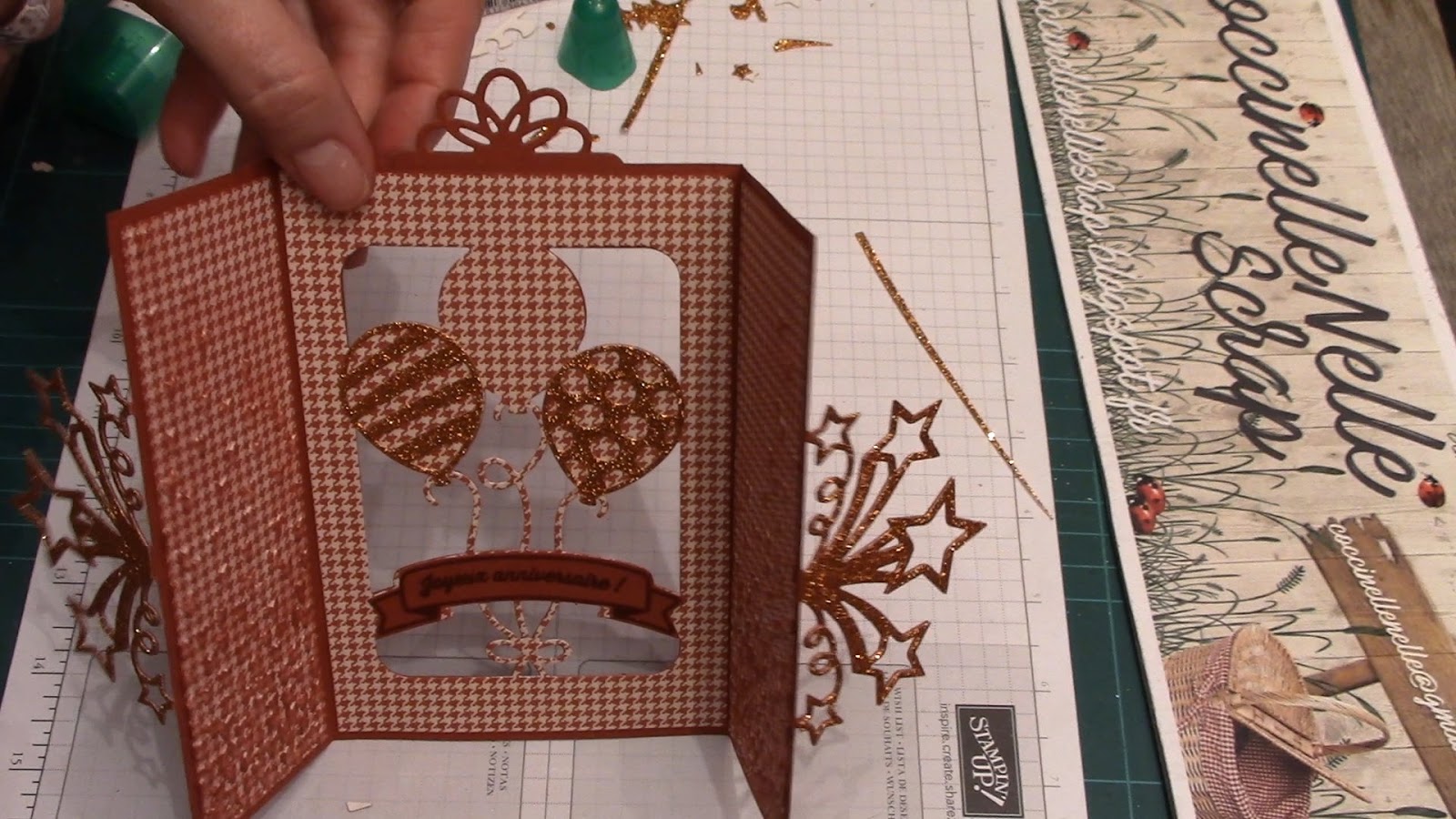 L\’idée aussi était de jouer la transparence en ajourant le fond de la carte avec la découpe Pop Up que j\’ai déjà eu le bonheur d\’utiliser, du set de poinçons \ »Ballons saillants\ ».