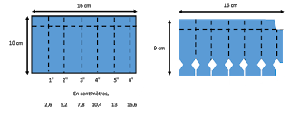 - 1 rectangle de papier cartonné de 16 cm x 10 cm, marqué en position paysage à 1\ », 2\ », 3\ », 4\ » 5\ » et 6\ » (2,6 cm – 5,2 cm – 7,8 cm – 10,4 cm – 13 cm – 15,6 cm) et en position portrait à 7/8\ » ;