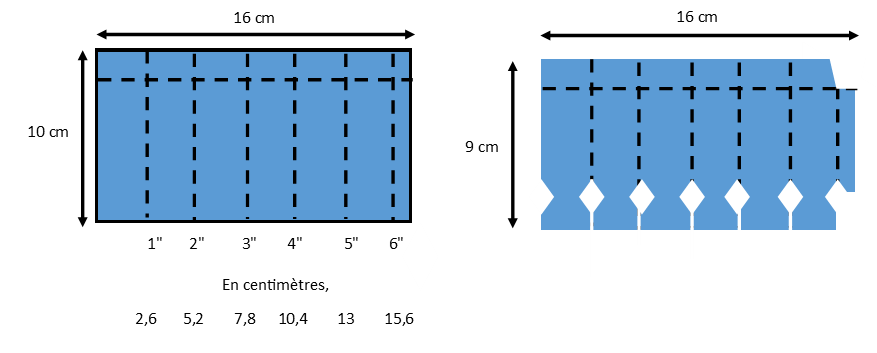 - 1 rectangle de papier cartonné de 16 cm x 10 cm, marqué en position paysage à 1\ », 2\ », 3\ », 4\ » 5\ » et 6\ » (2,6 cm – 5,2 cm – 7,8 cm – 10,4 cm – 13 cm – 15,6 cm) et en position portrait à 7/8\ » ;