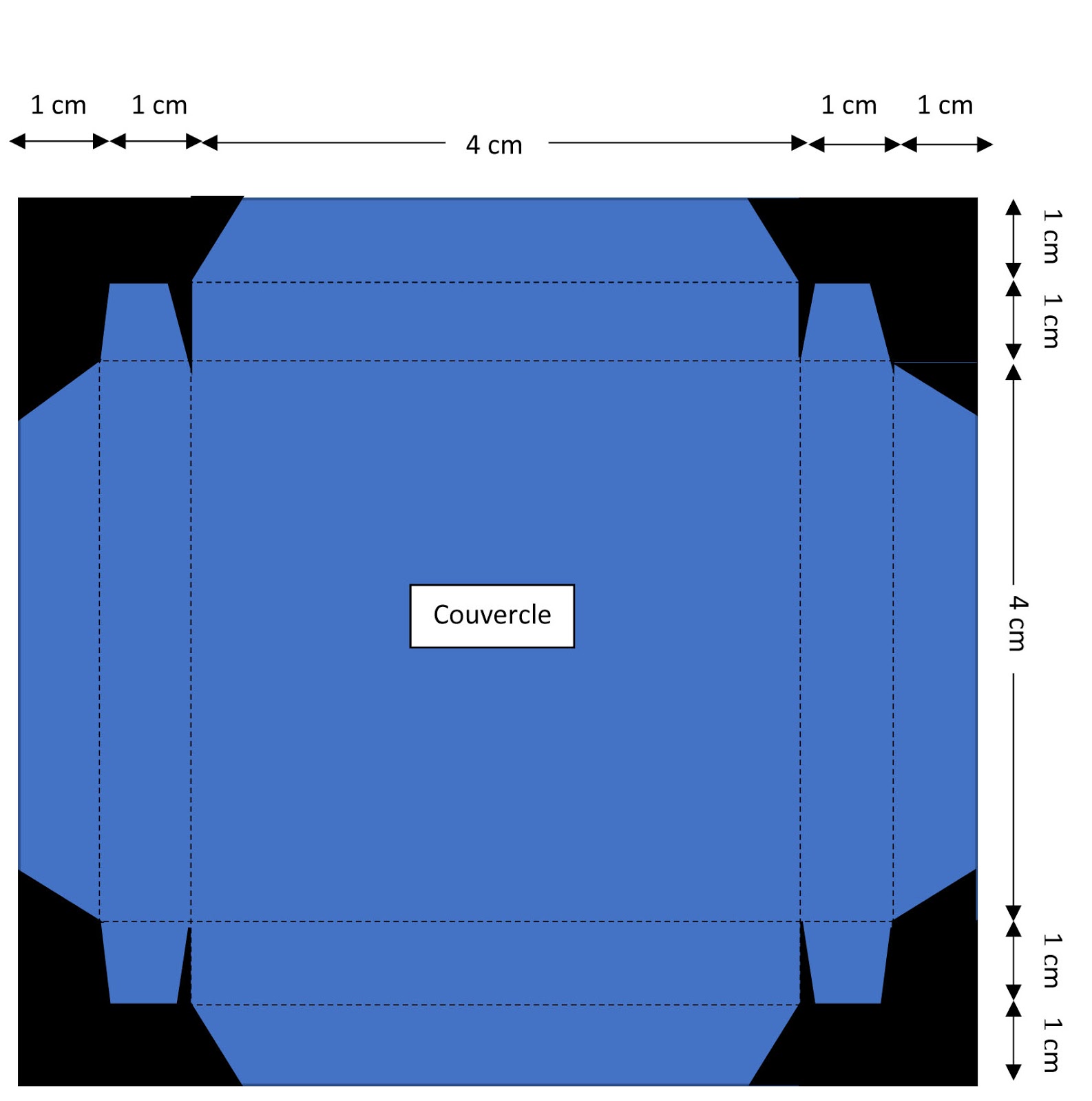 - 1 carré de papier cartonné blanc de 8 cm de côté (3\ »1/8 x 3\ »1/8), plié à 1 et 2 cm de chaque côté (3/8\ » et 6/8\ ») ;