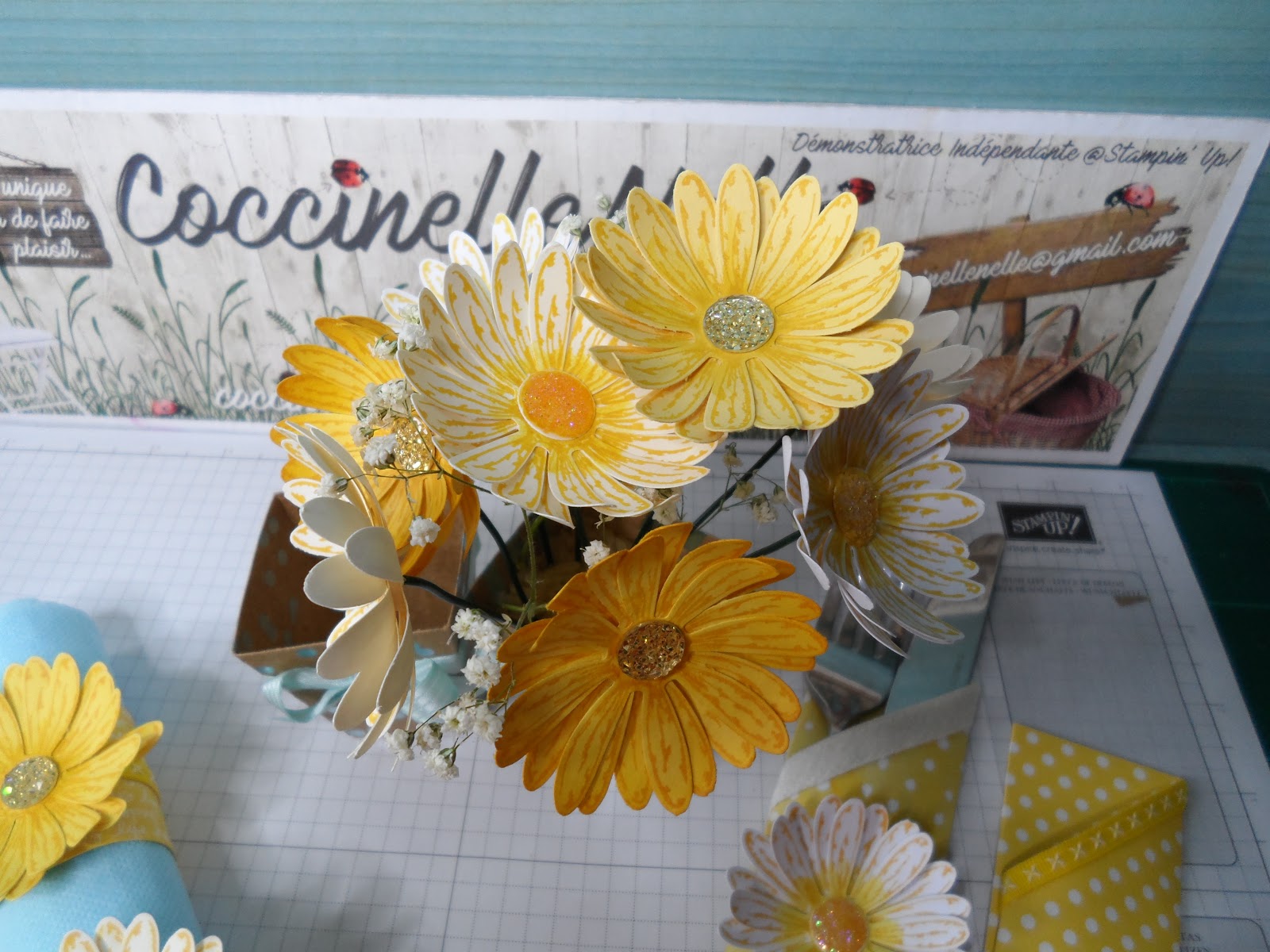 Cet été, je vous propose de leur préparer une charmante décoration à l\’aide du set de tampons \ »Adorable marguerite\ » (réf. 144395) et de sa perforatrice (réf. 143713).