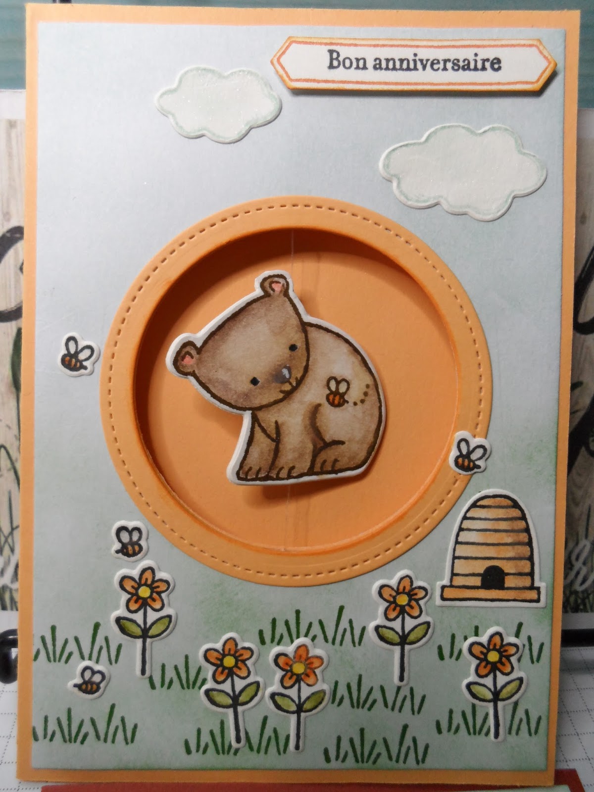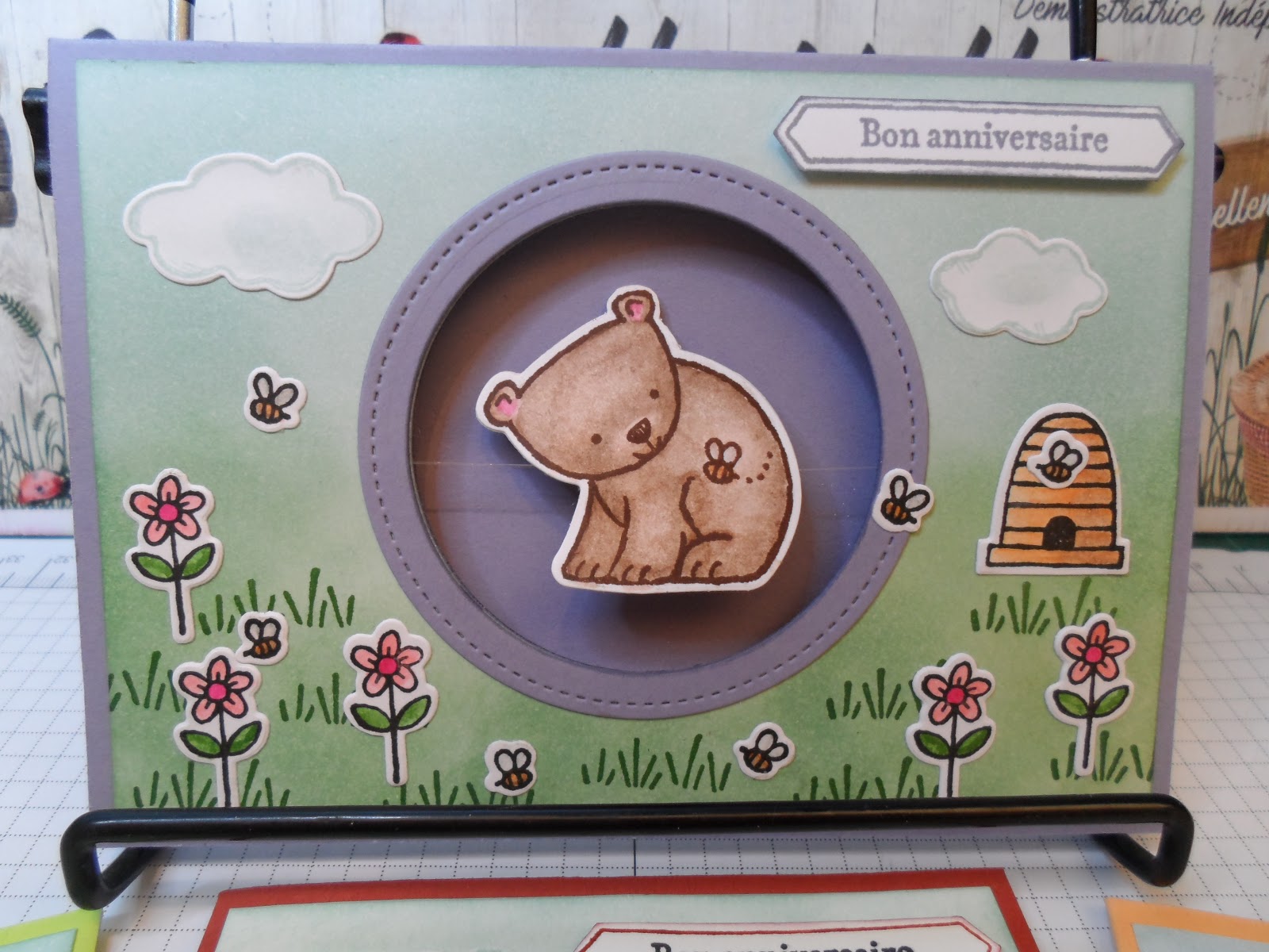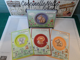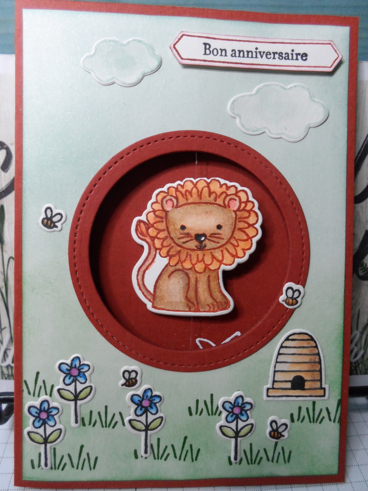 Pour la carte ourson, j\’ai utilisé pour l\’une le papier cartonné \ »Pêche fraîche\ » et pour l\’autre \ »Galante Glycine\ ». Quant à la carte lion, je me suis servie du papier cartonné \ »Ocre roussillon\ ».