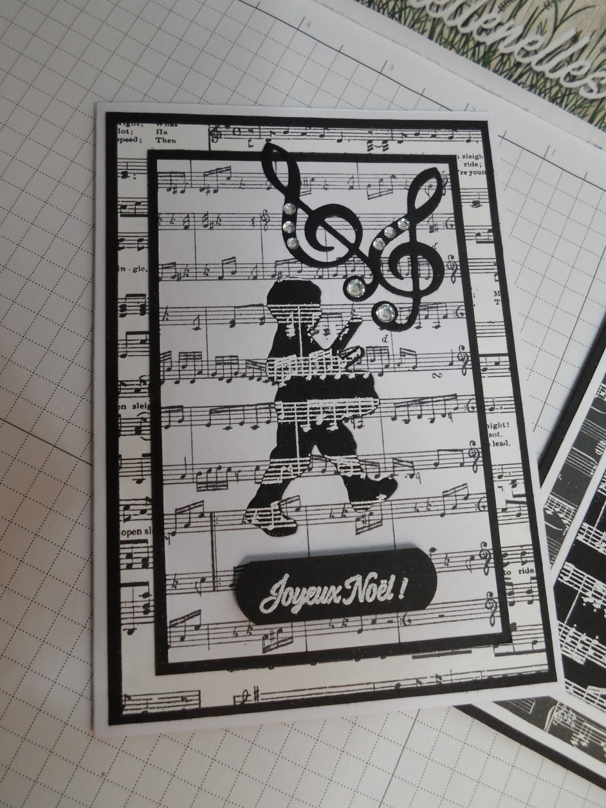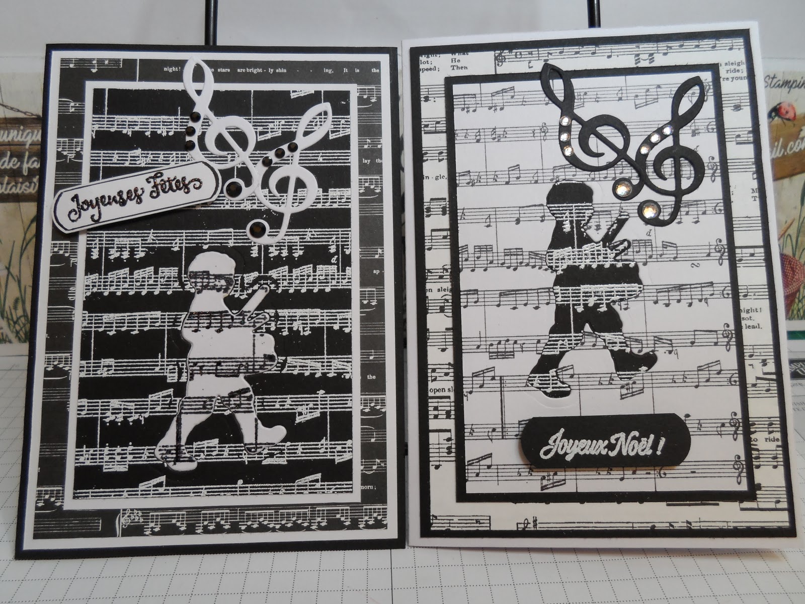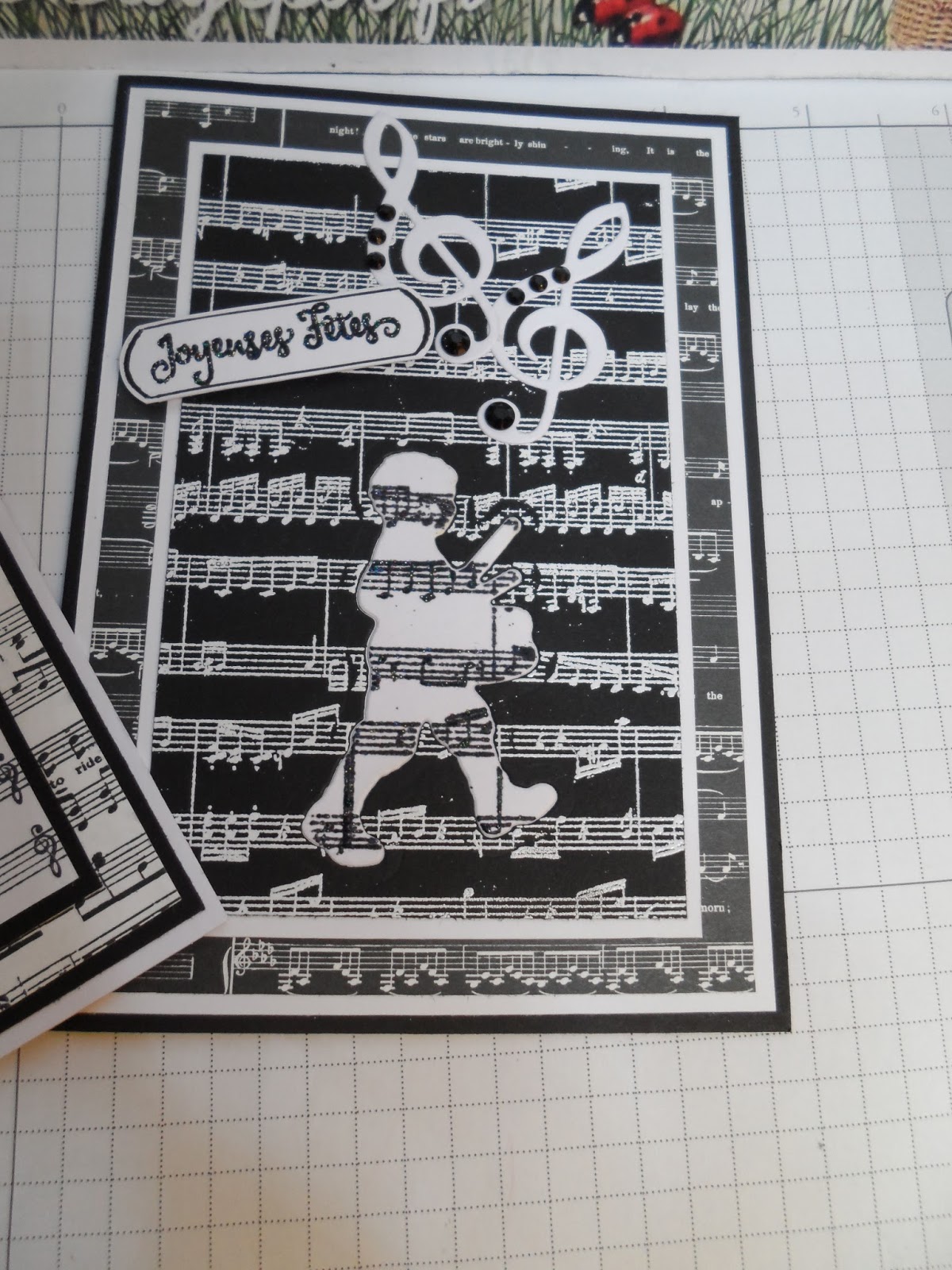 J\’aime beaucoup l\’illusion qu\’elle donne en laissant supposer que le petit garçon au tambour passe derrière la partition. J\’adore également le tampon et le tamponnage de l\’intérieur de la carte.