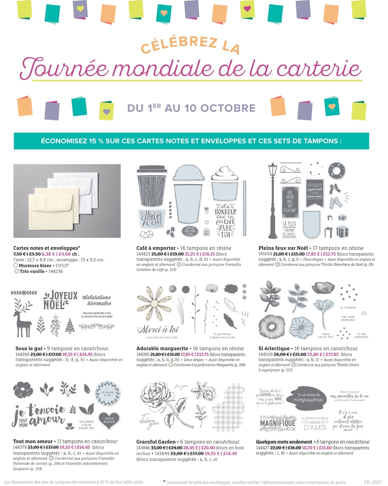 - la première concerne la journée mondiale de la carterie qui sera fêtée, cette année, le 7 octobre prochain. Pour célébrer cet événement, Stampin Up vous propose pendant 10 jours (du 1er au 10 octobre) de bénéficier de 15% de réduction sur une sélection de set de tampons et carte-note et enveloppe + une promotion sur l\’adhésif fusion rapide