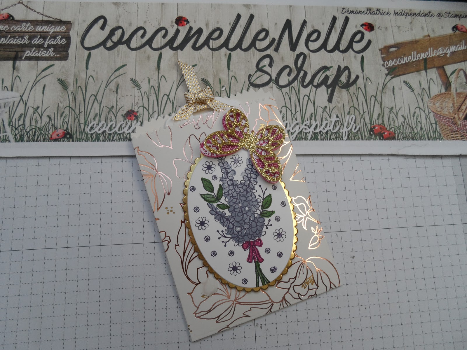 Pour ces projets simples, faciles et rapide à réaliser, j\’utilise le papier de la série design spécialité Printemps métallisé, les sets de tampons \ »Lots of lavender\ », \ »Joli paon\ », \ »Fête épique\ » et le lot de rubans miroitants méli-mélo.