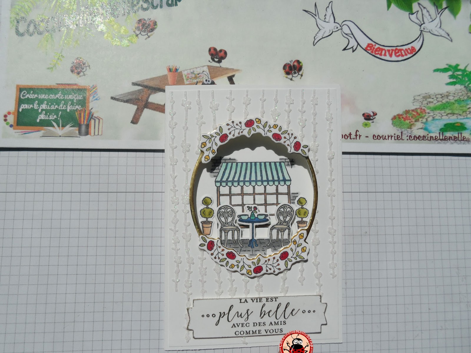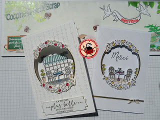 Si vous ne vous étiez pas spécialement penché(e) sur le lot (tampons et poinçons) \ »Café Charmant\ », alors je vous invite à y regarder de plus près car pour réaliser une carte originale en deux temps, trois mouvements… ou presque, il n\’a pas son pareil. D\’autant que le grand poinçon de forme ovale vous permettra également de créer de magnifiques étiquettes fleuries.