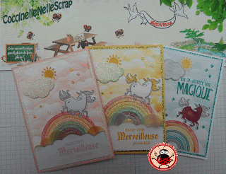 Pour le papier décoré avec les nuages, il faut garder le papier cartonné \ »Murmure blanc\ ». Ce sont les encres qu\’il faut adapter à la couleur de votre carte.