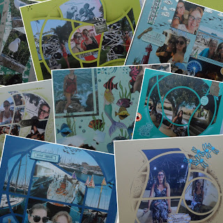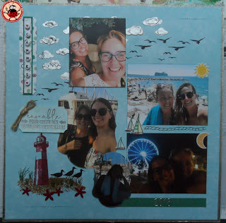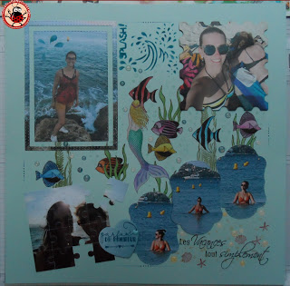 Conçue également comme un pèle-mêle, j\’ai utilisé pour la page 4 \ »Les vacances tout simplement\ », les poinçons \ »Pièces de puzzle\ » et \ »Saisons à coudre\ » pour découper les photos. J\’ai décoré la page avec quelques pois laqués brillants et les sets de tampons \ »Magical mermaid\ » et \ »Seaside shore\ » (celui-ci n\’est plus en vente) que j\’ai coloriés avec les crayons aquarelle.
