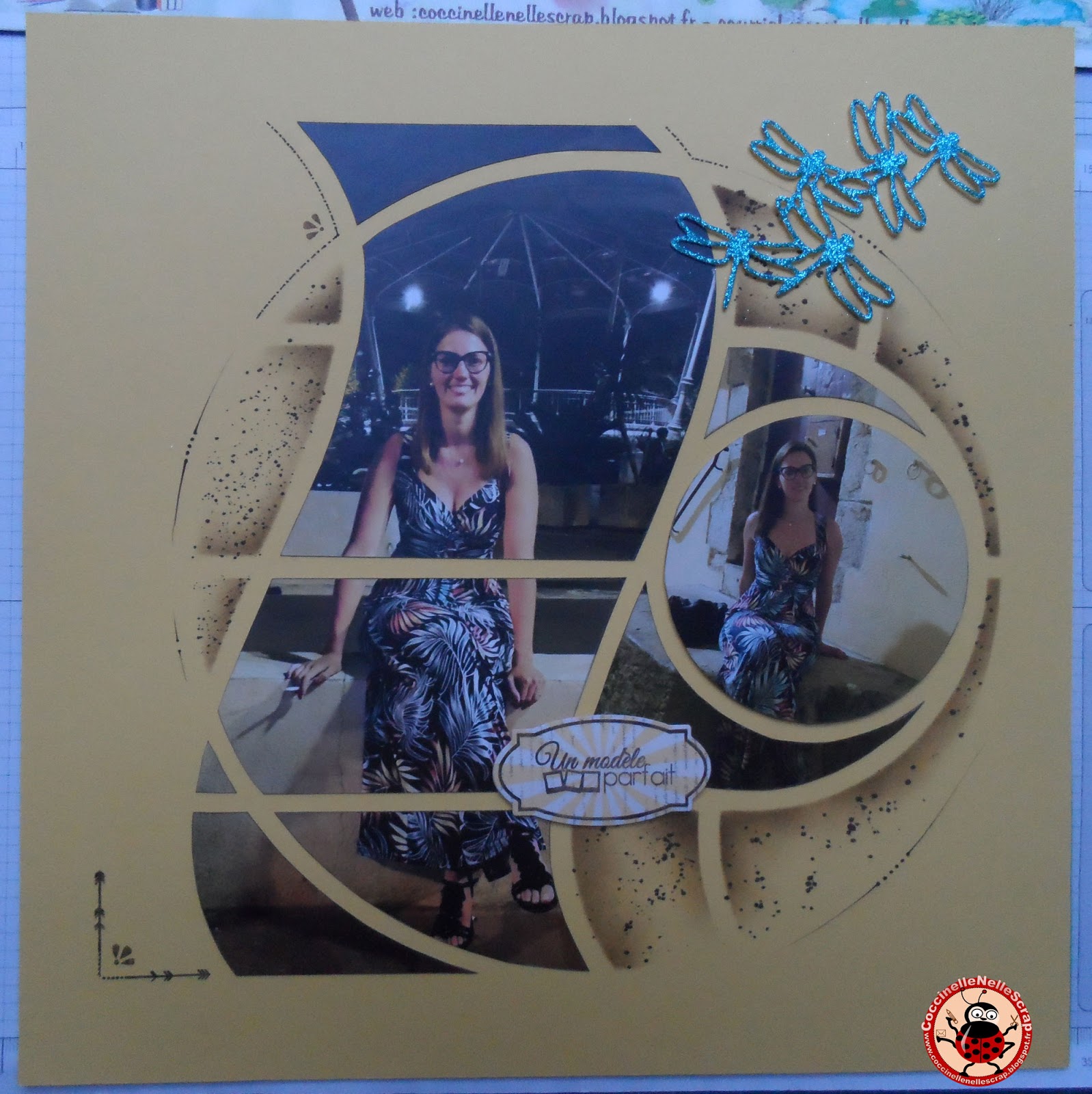 Du papier cartonné 12\ »x 12\ » \ »Narcisse délice\ » sert de support à la page 7 que j\’ai nommé \ »Une belle soirée\ ». Les ombrages sont encrés en \ »Doux suède\ ». Les taches et les traits de contour sont en \ »Couleur café\ ». J\’ai ajouté l\’envolée de libellules avec les Thinlits \ »Libellule ouvragée\ » découpée sur du papier à paillette.