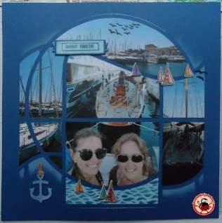 Sur la page 5 \ »Le vieux port\ », on retrouve les voiliers découpés avec les Framelits \ »Au bord du lac\ » ainsi que l\’étiquette, et coloriés avec les crayons aquarelle.