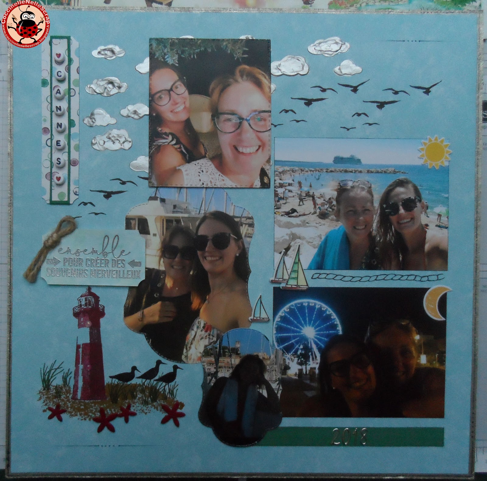 J\’ai voulu concevoir la première page \ »Cannes 2018\ » qui fait office de page de couverture, comme une sorte de pèle-mêle. Je ne sais pas si cela se fait mais personnellement cette idée me séduisait. Pour cette page, j\’ai utilisé en papier de fond une feuille de la série désign \ »Texture apaisantes\ ». Certaines photos sont coupées avec le coupe papier et d\’autre avec les poinçons actuellement disponibles en exclusivité jusqu\’au 31 août 2018 \ »Saisons à coudre\ ». J\’ai utilisé le set de tampons \ »Marée Haute\ » pour le phare et les oiseaux dans le ciel. Les nuages, quant à eux, ont été embossés avec de la pâte à embosser argent à l\’aide du pochoir \ »nuages\ » issu du lot de pochoirs décoratifs \ »motifs en tous genres\ ». Les voiliers viennent des Framelits \ »Au bord du lac\ ». Je les ai coloriés avec les crayons aquarelle. Les étoiles de mer sont issues des Framelits \ »Sous la mer\ ». Enfin, j\’ai utilisé le set de tampons \ »Du marché bio\ » et les découpes associées \ »Caisse en bois\ » pour ce qui concerne le soleil et la lune.