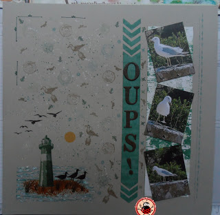 La page 6 \ »La mouette\ » met en valeur les photos d\’une mouette positionnées sur du papier de la série design \ »Textures apaisantes\ », collé sur du papier cartonné 12\ »x 12\ » \ »Sable du Sahara\ ». A l\’aide du set de tampons \ »Jolie promenade\ » et l\’encre \ »Marée montante\ », j\’ai réalisé une frise à droite et j\’ai décoré la page avec le phare et les oiseaux du set de tampons \ »Marée haute\ ». Pour les reflets brillants sur la mer, j\’ai saupoudré des paillettes \ »Diamants resplendissants\ » sur de la colle de précision.