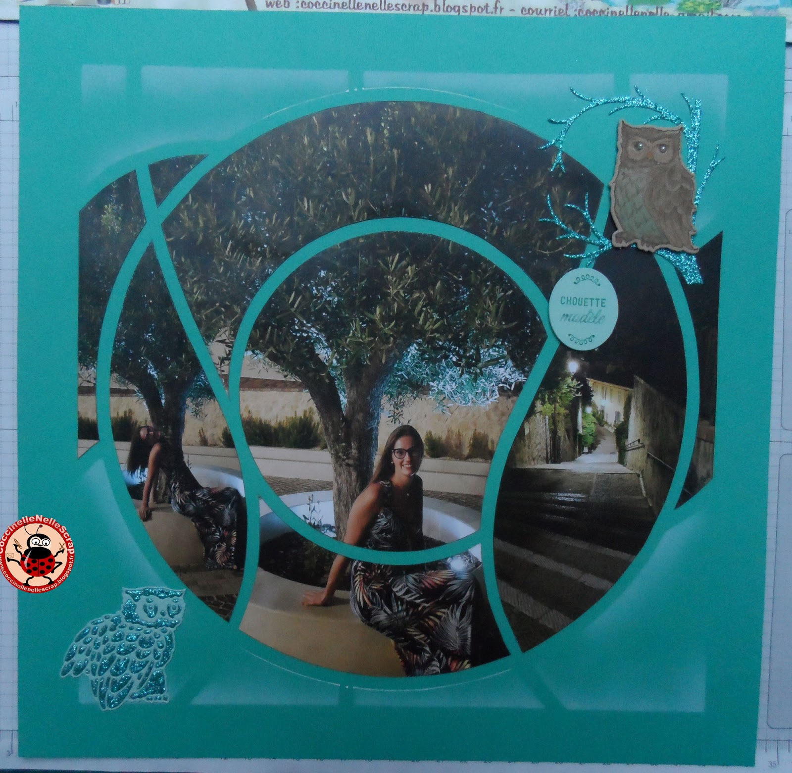 Enfin, la page 8 \ »Sous l\’olivier\ » est présentée sur du papier cartonné 12\ »x 12\ » \ »Baie des Bermudes\ ». Les ombrages sont encrés en \ »Murmure blanc\ » et les embellissements sont tirés du set de tampons et de poinçons \ »Nuit de paix\ » à paraître dans le nouveau catalogue saisonnier automne-hiver 2018.