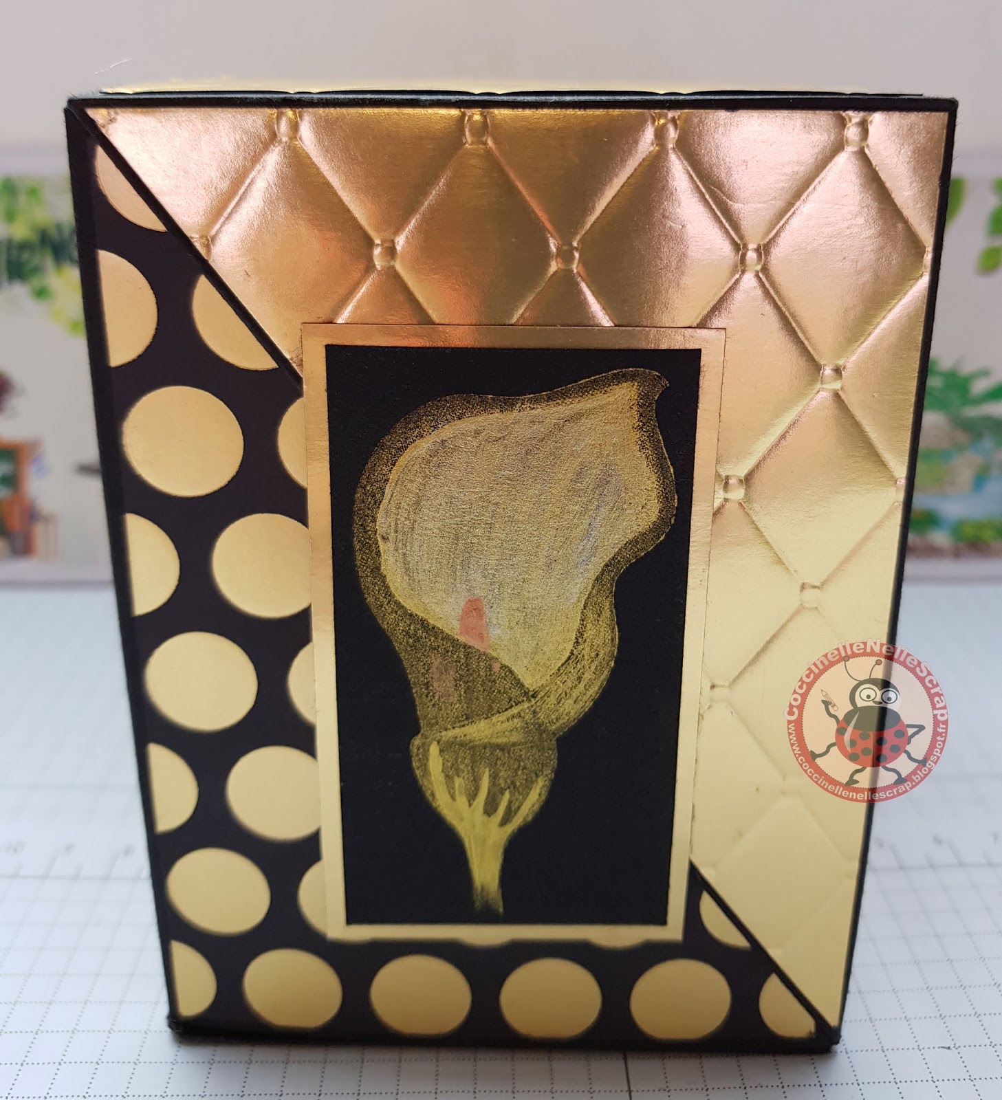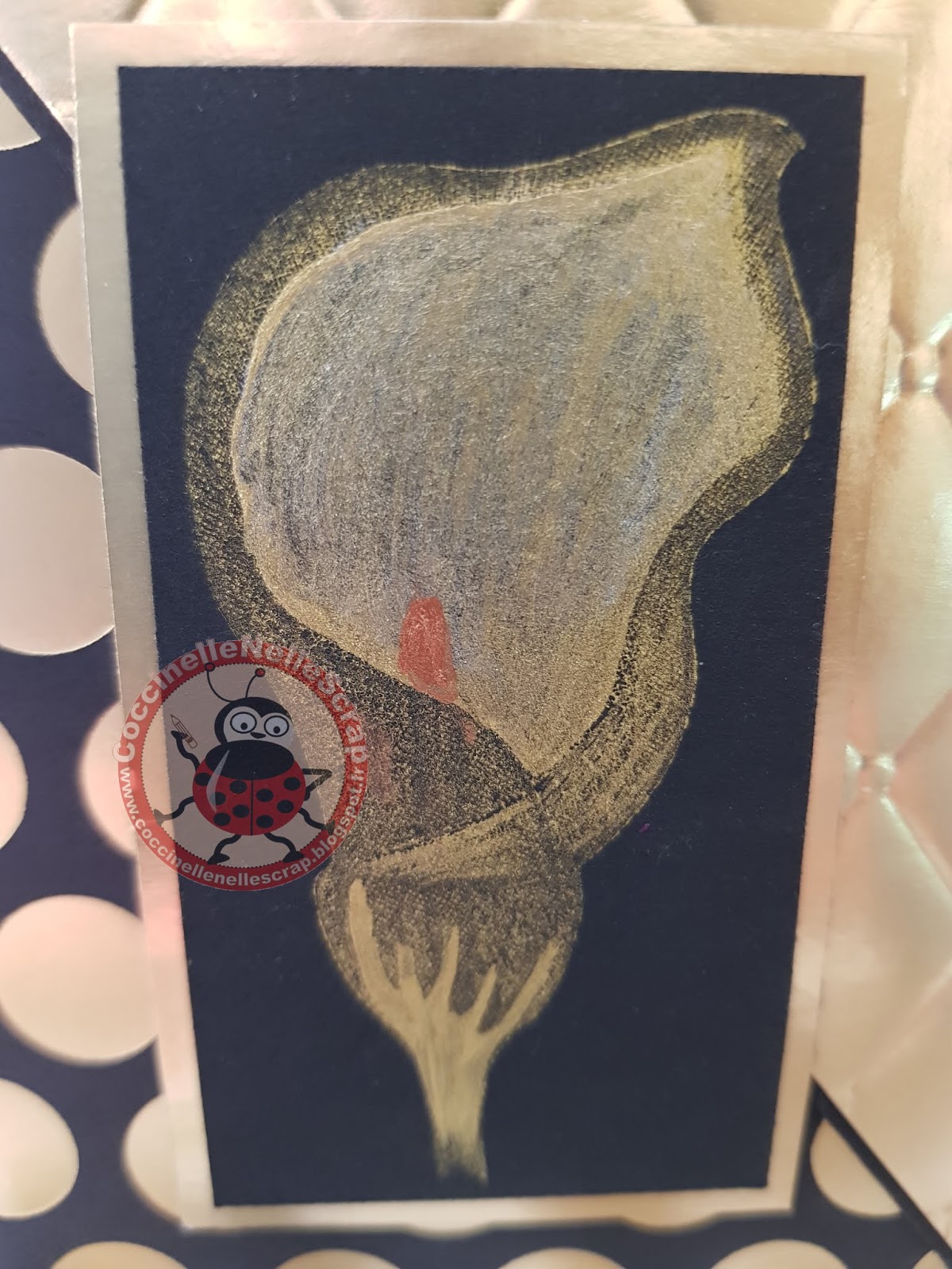 2 rectangles de papier cartonné \ »Noir nu\ » d\’environ 7,5 x 4 cm sur lesquels j\’ai tamponné la grosse fleur Calla éternelle avec la peinture chatoyante \ »Or\ » puis au pinceau pour lui donner un effet \ »peinture d\’artiste\ », je suis venue ajouter quelques touches de peinture chatoyante \ »Blanc de givre\ ».