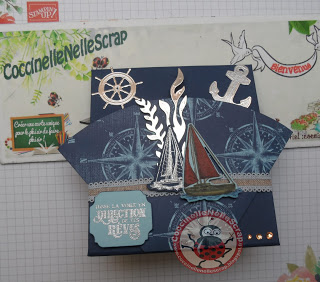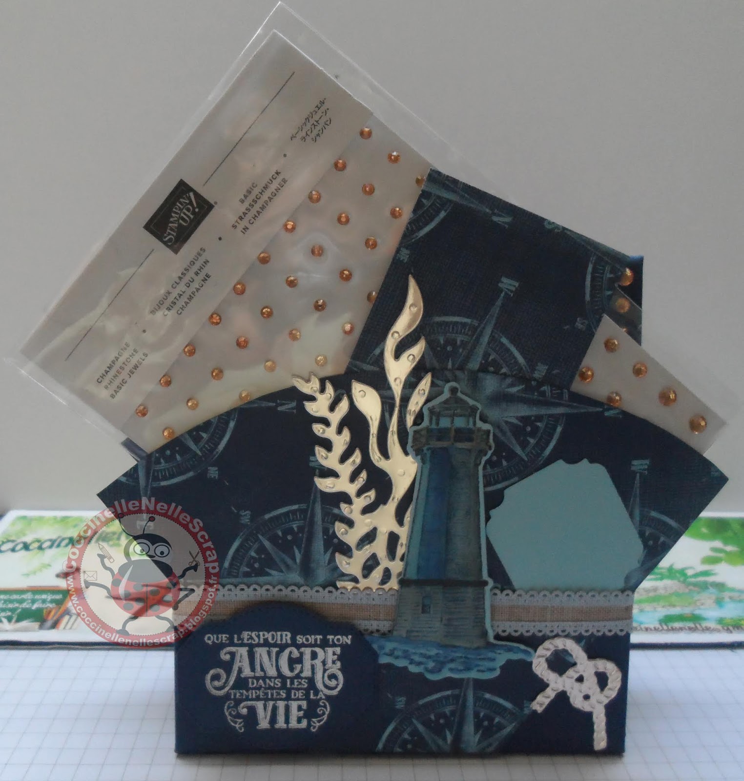 des chutes de papier Design \ »Larguons les amarres\ » pour découper 2 fois le filtre à café et des chutes de papier cartonné \ »Bleu nuit\ » pour également découper 2 fois le filtre à café avec un surplus d\’onglets, des chutes de papier métallisé et de papier cartonné \ »Béguin bleu\ » pour les décorations.