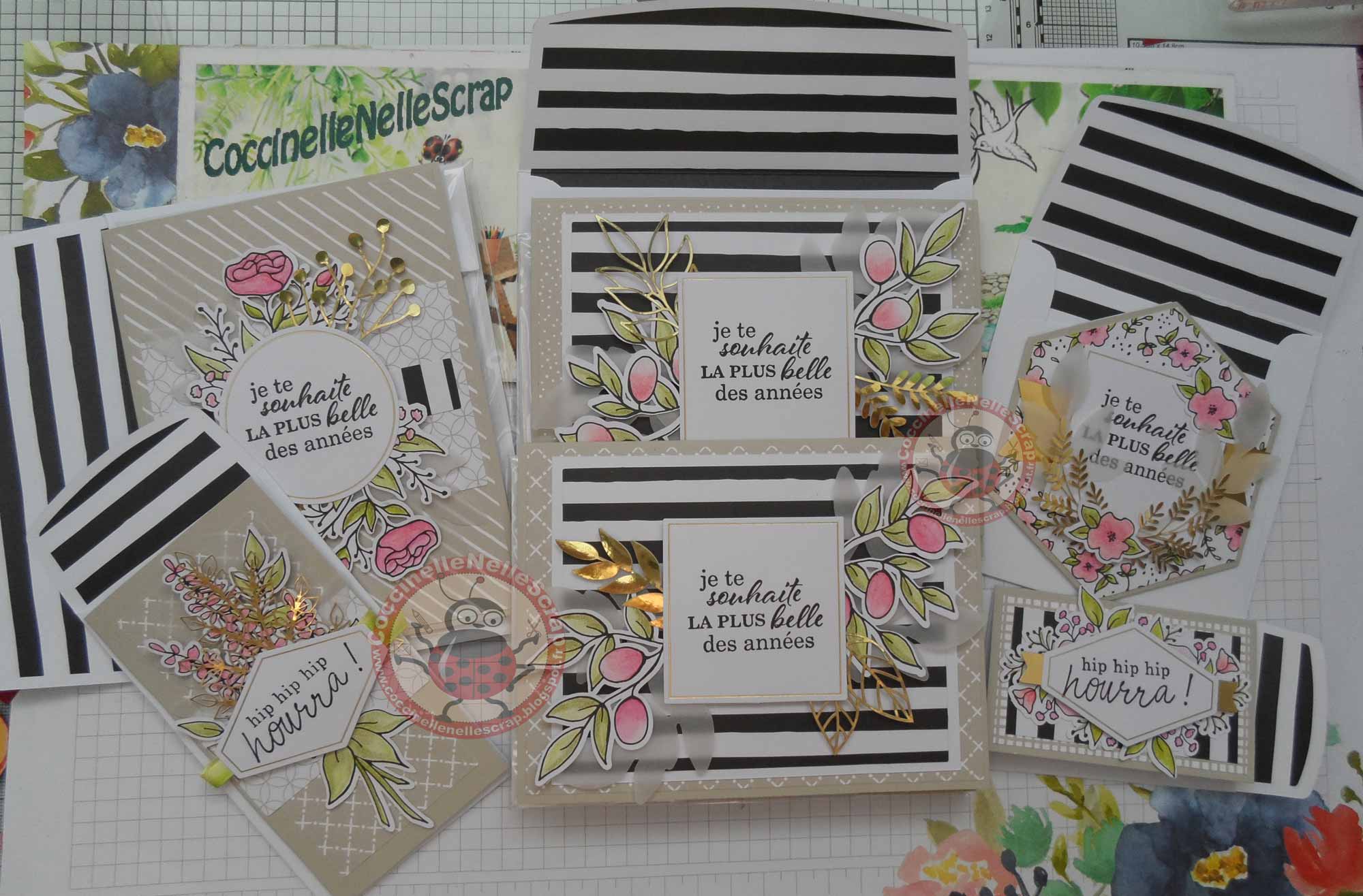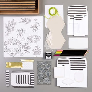 PS : Il y a de quoi se régaler dans ce kit qui permet de confectionner 20 cartes (4 de 5 motifs chacune) et qui contient un set de 7 tampons en photopolymère (anglais), un bloc acrylique, 20 bases de cartes et enveloppes coordonnées, coffret cadeau en kraft, décorations à colorier, feuillage en vélin, étiquettes blanc/or et métallisées or, mini-encreur Noir nu, crayons aquarelle \ »Flamant fougueux\ », \ »Fruit des bois\ », \ »Vert olive\ » et \ »Grenouille guillerette\ ». Couleurs coordonnées : Noir nu, Flamant fougueux, Vert olive, Grenouille guillerette, Fruit des bois, Sable du Sahara.