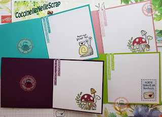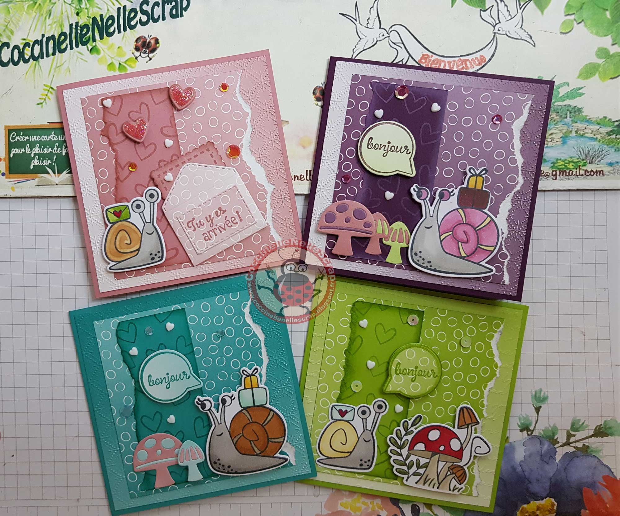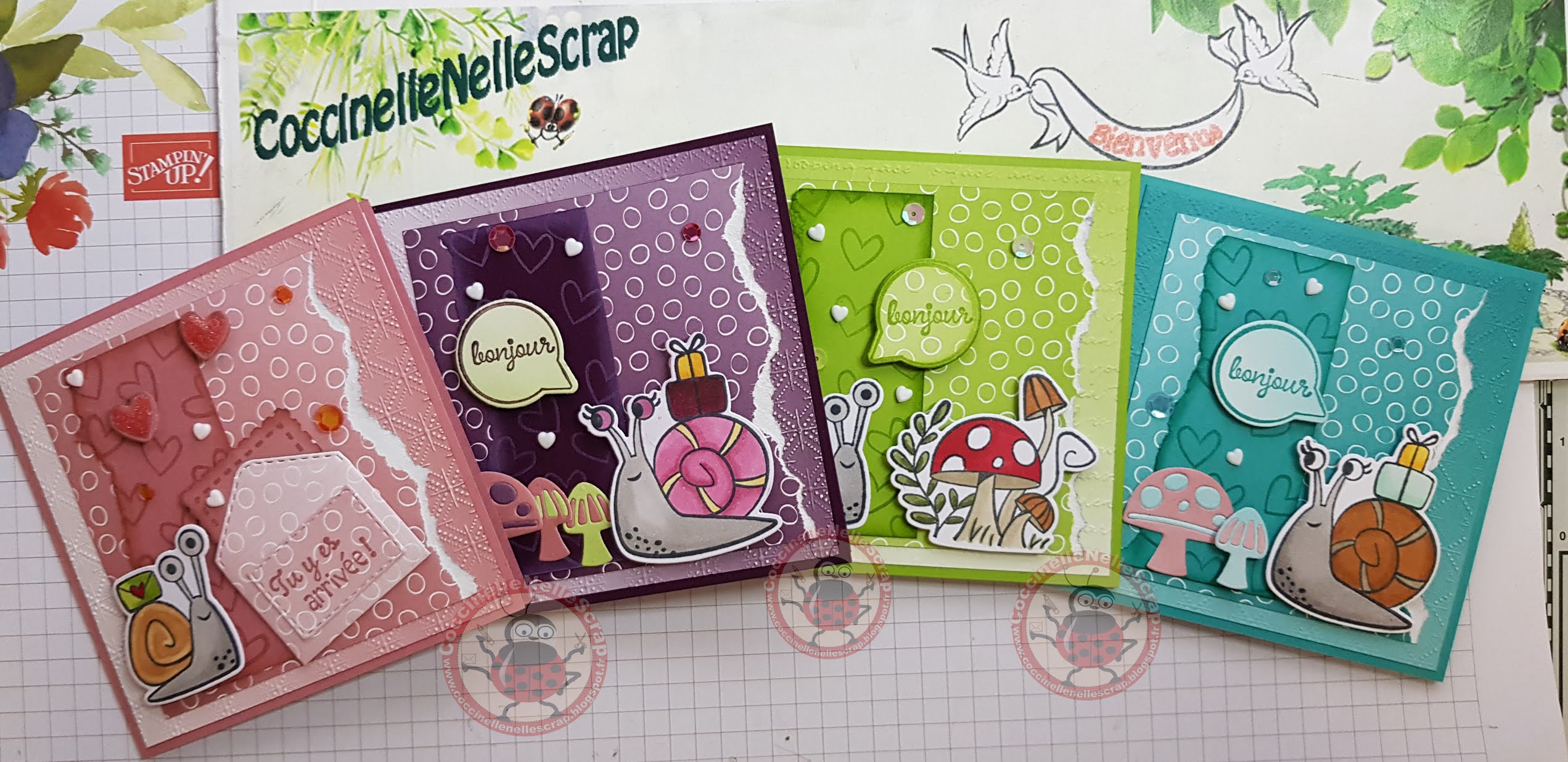 Pour la base de carte, j\’ai utilisé les papiers cartonnés Baie des Bermudes, Rose Rococo, Cuvée de Cassis et Grenouille guillerette.