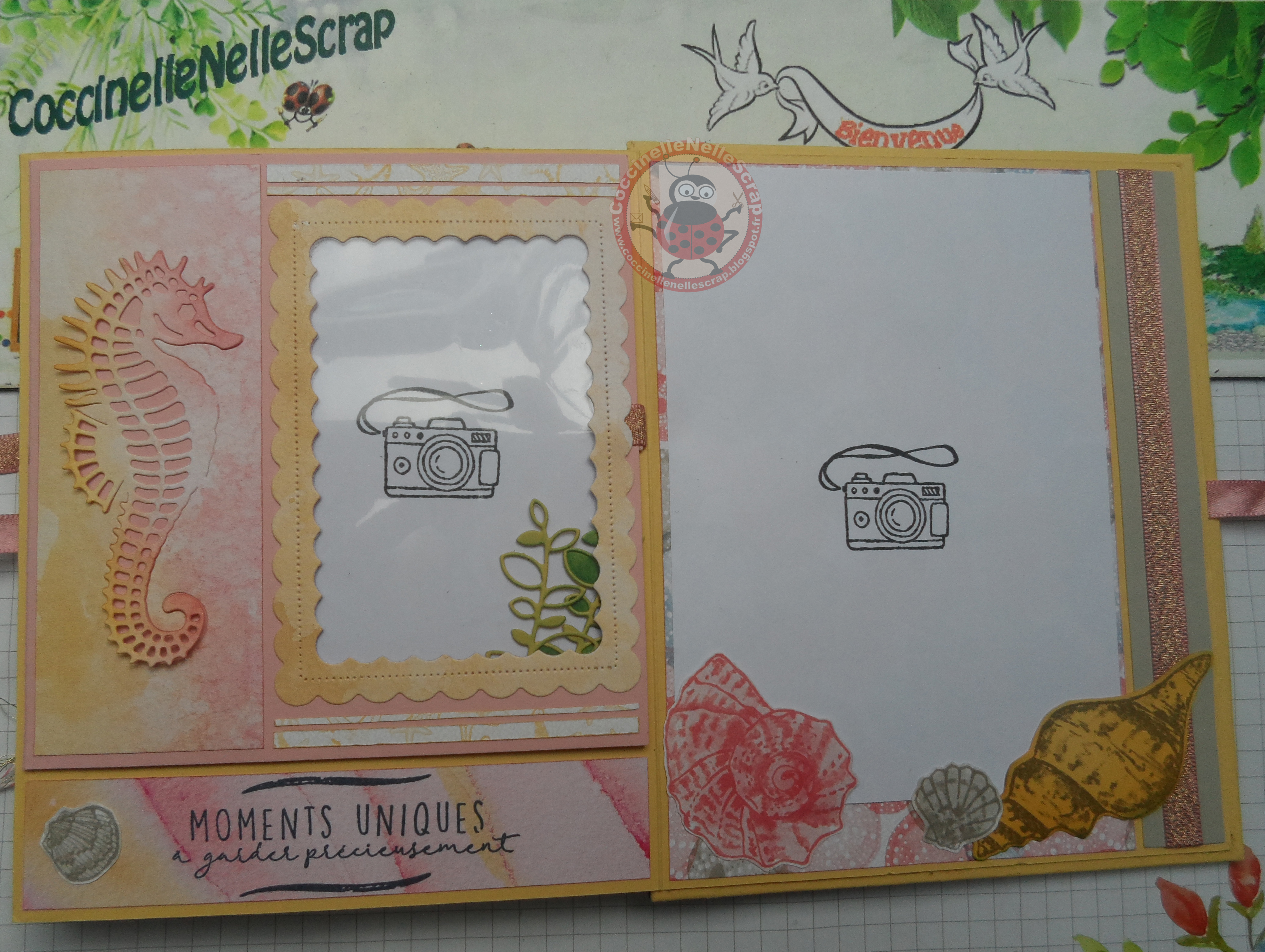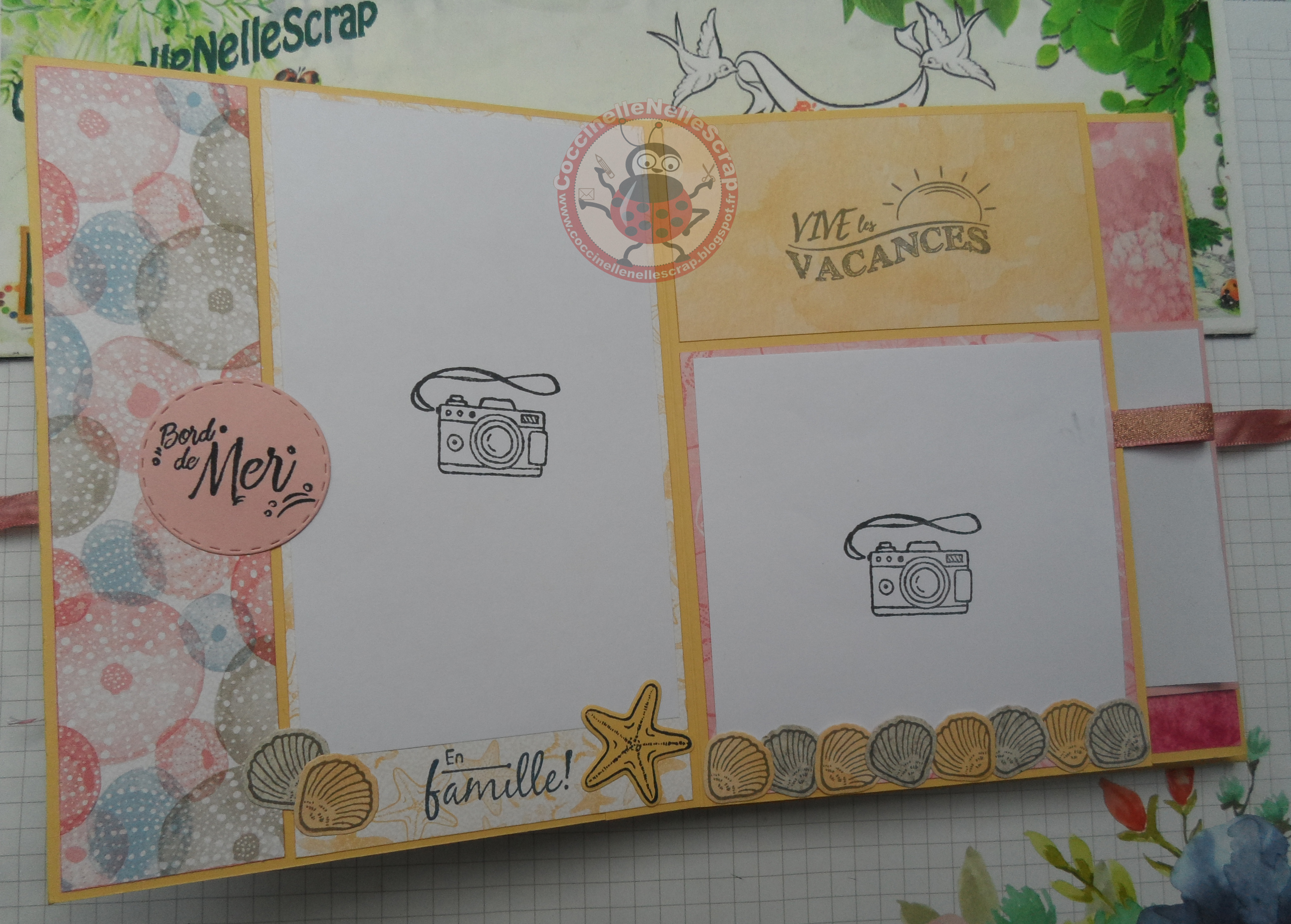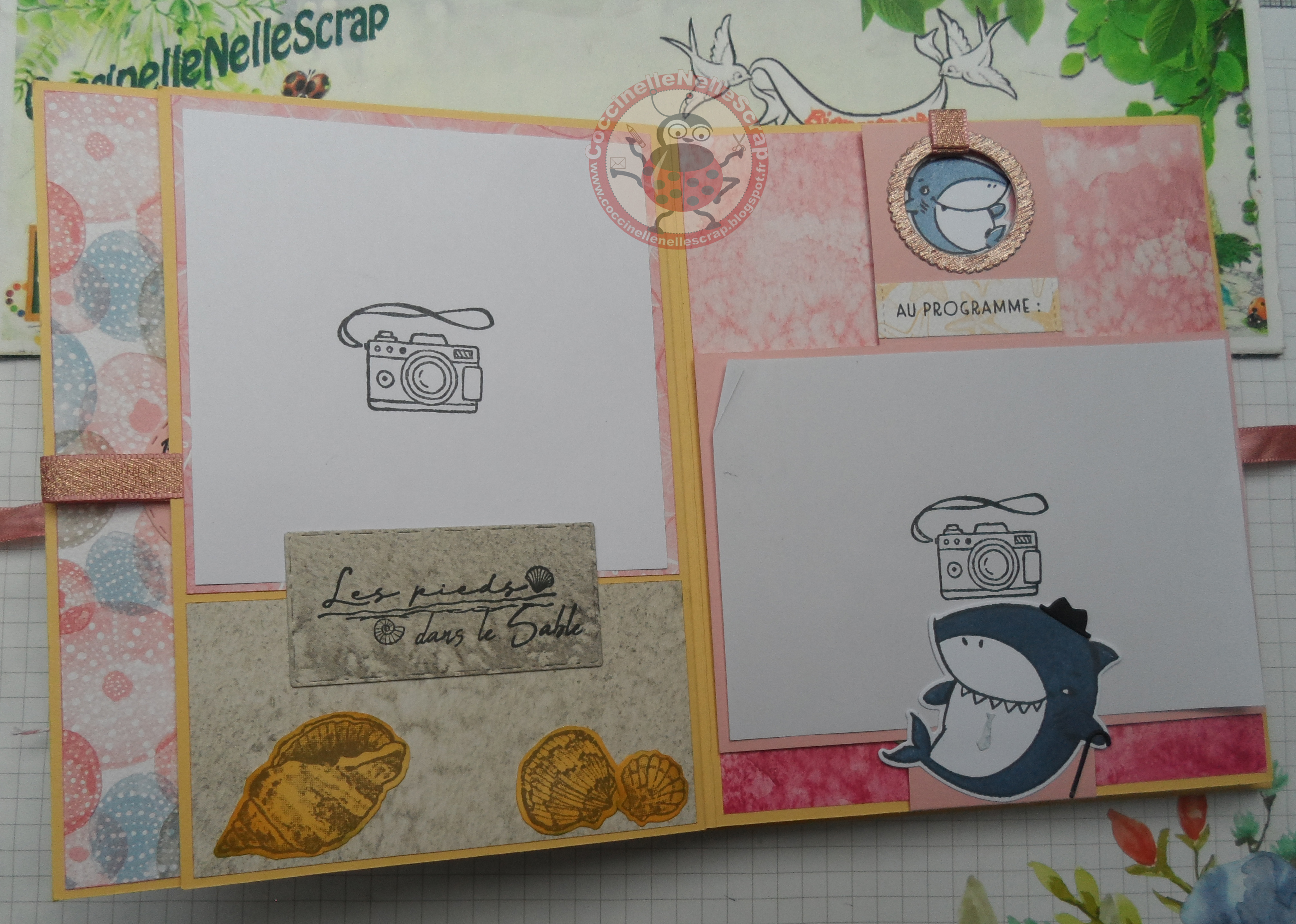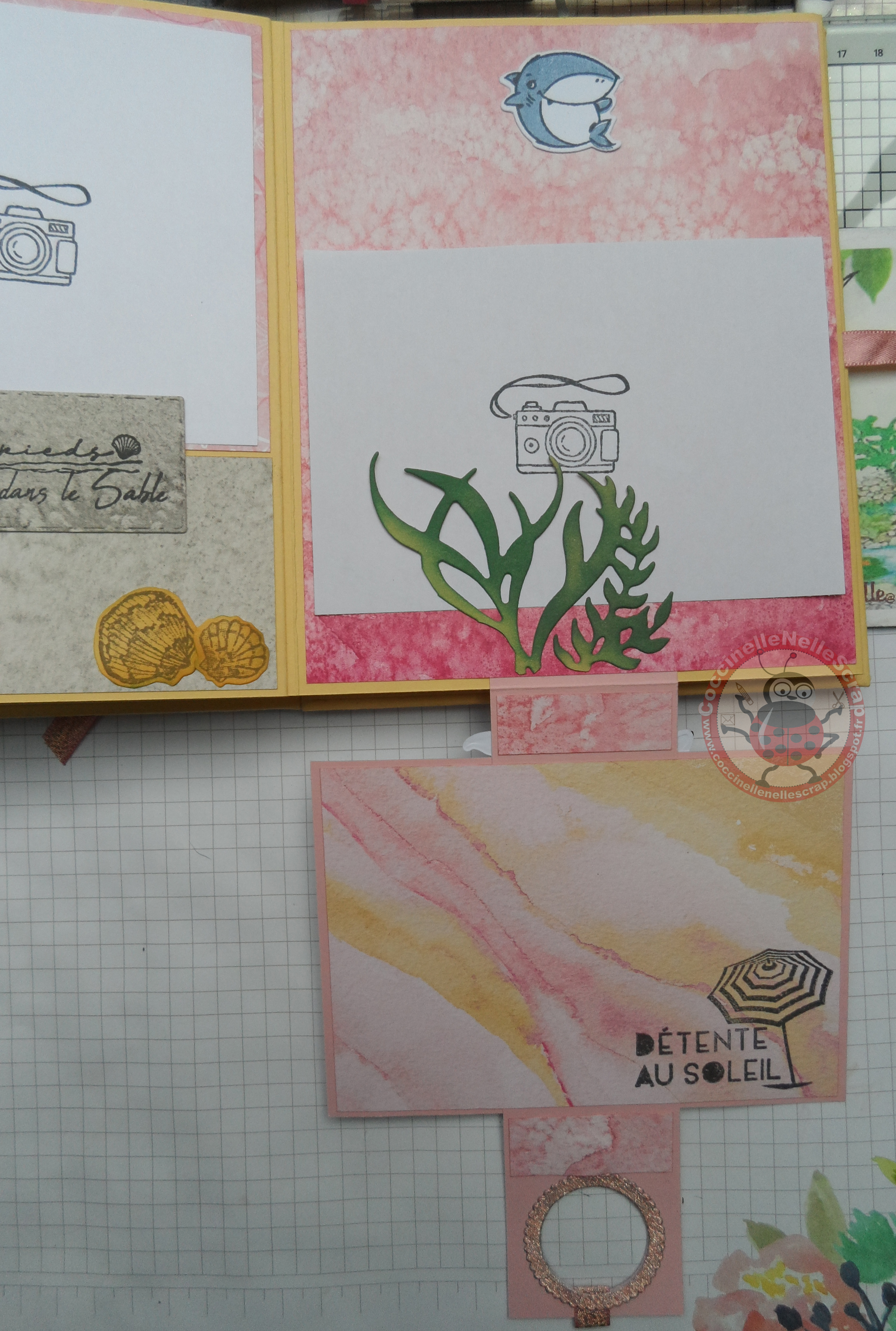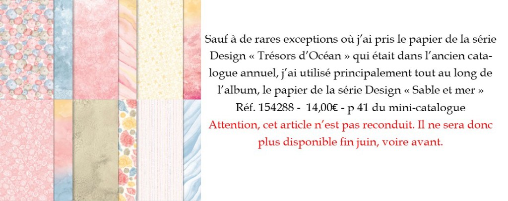 à l’approche des vacances estivales, je vous propose de réaliser pour notre prochain atelier créatif mensuel, la structure d’un mini-album pour y classer les photos de vos vacances. Le mien suggère une version de « Vacances à la mer » mais vous pourrez décorer le vôtre comme vous le souhaitez. J’ai utilisé principalement le papier Design « Sable et mer » et les papiers cartonnés « Tellement safran » et « Fleur de cerisier ».