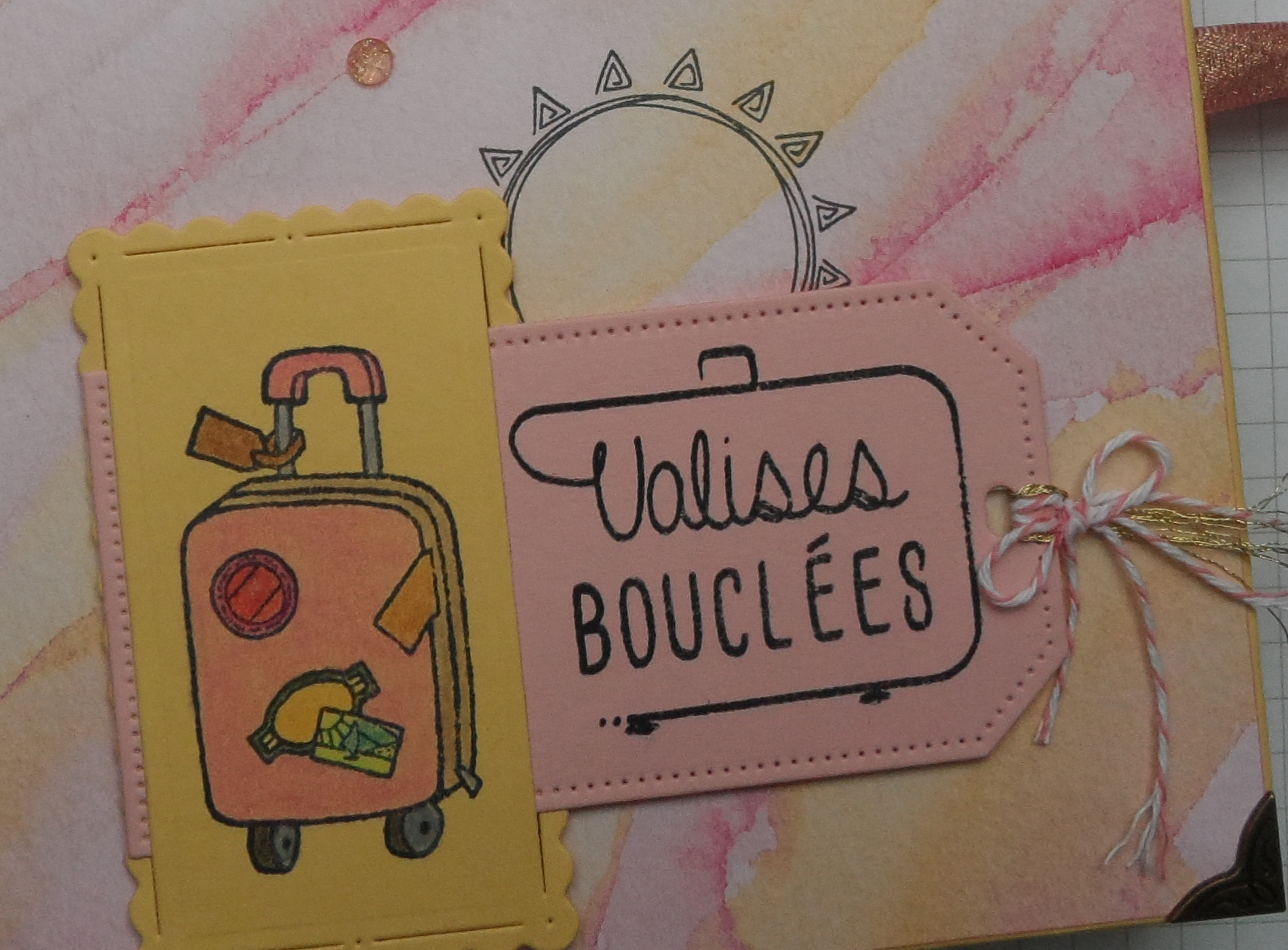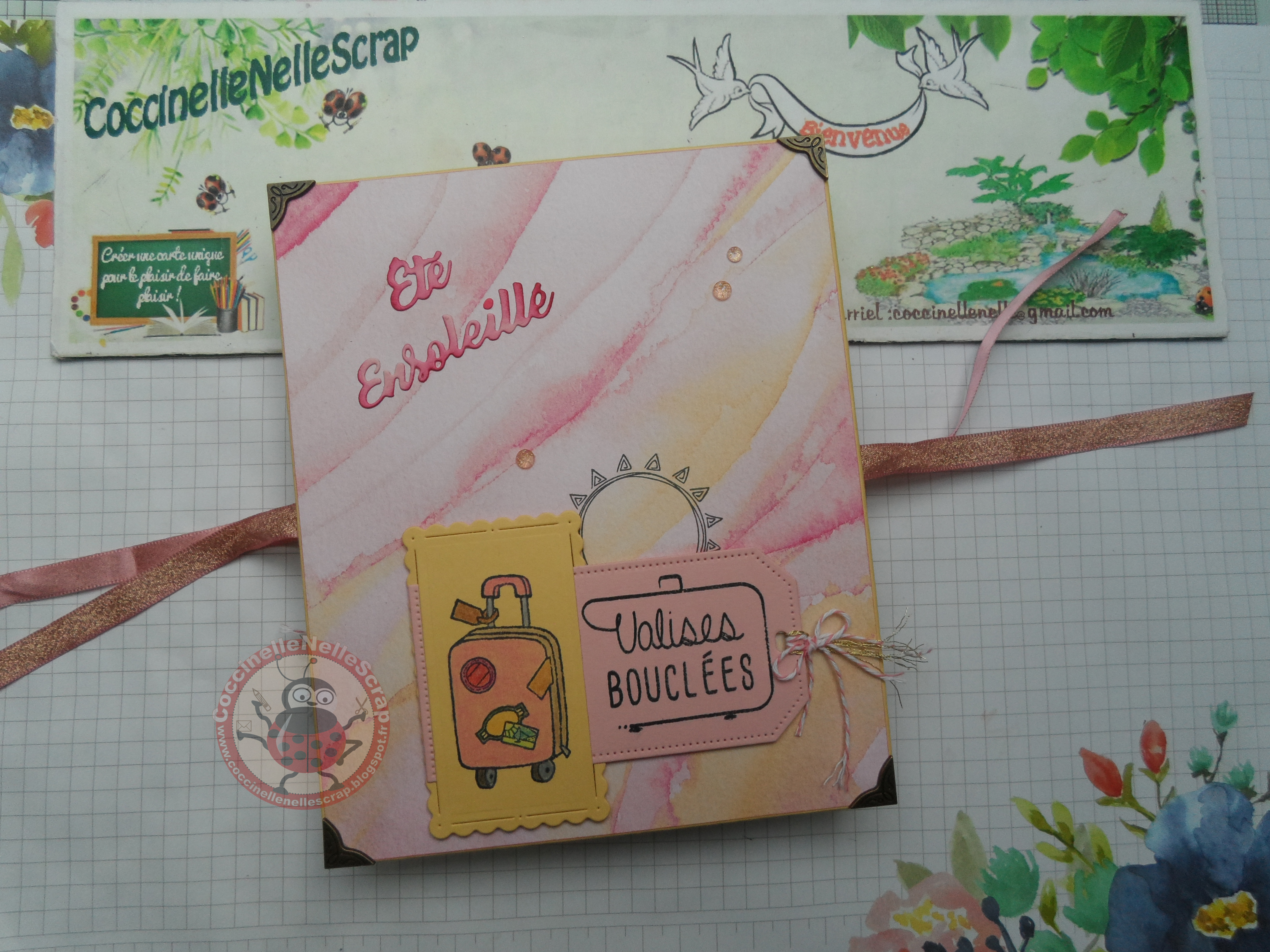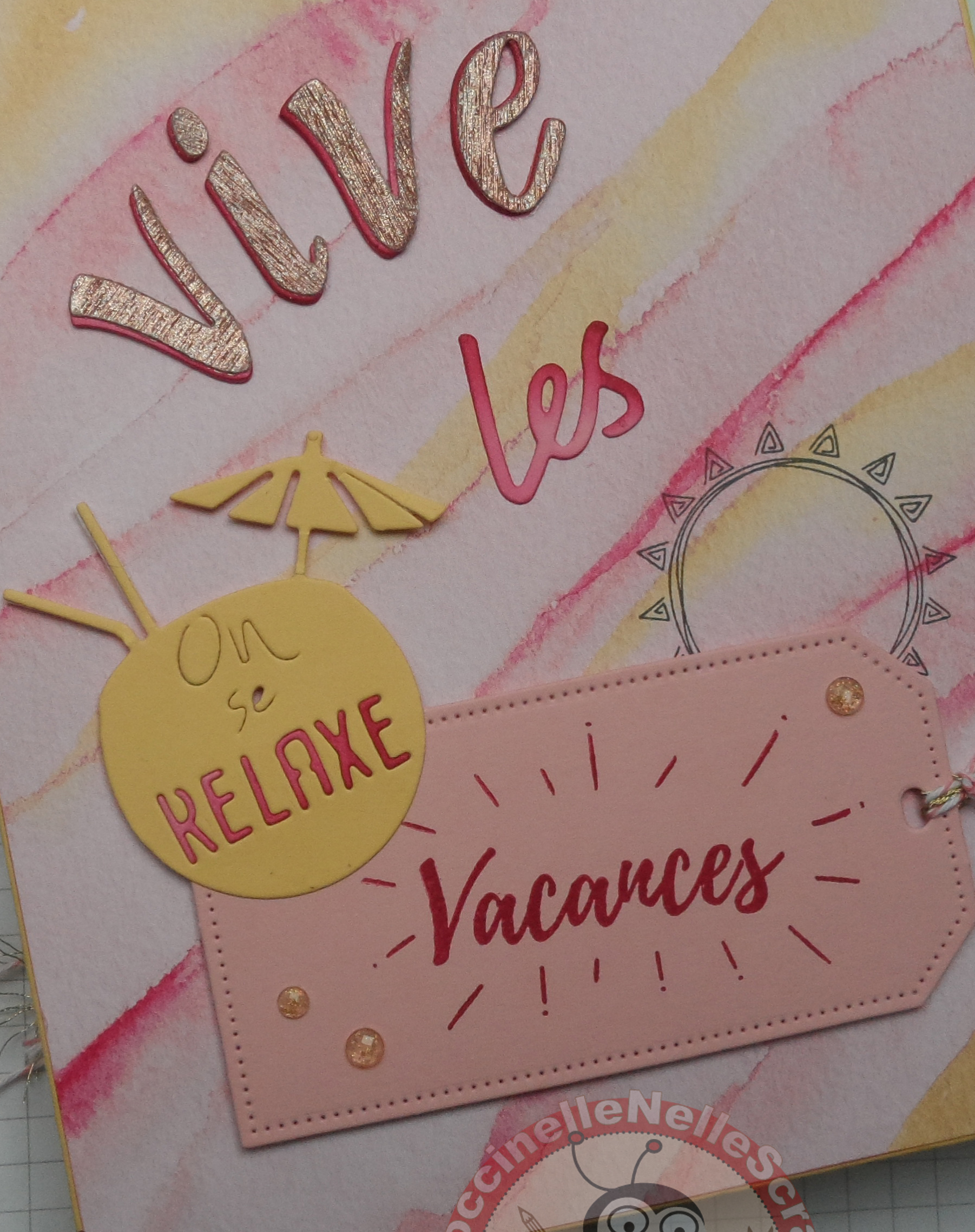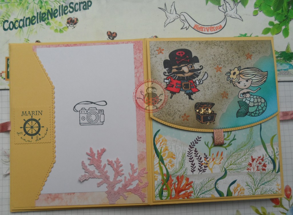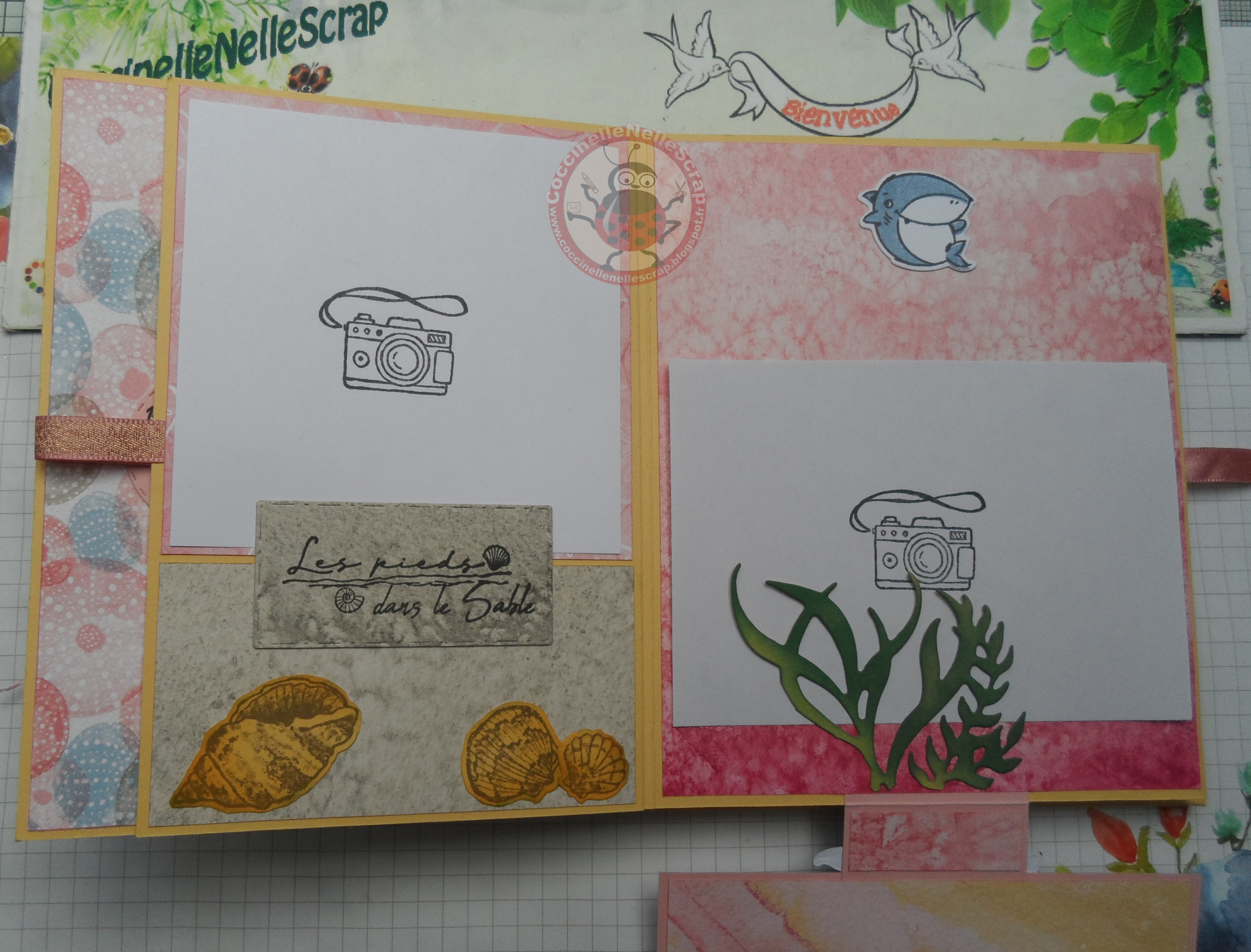 à l’approche des vacances estivales, je vous propose de réaliser pour notre prochain atelier créatif mensuel, la structure d’un mini-album pour y classer les photos de vos vacances. Le mien suggère une version de « Vacances à la mer » mais vous pourrez décorer le vôtre comme vous le souhaitez. J’ai utilisé principalement le papier Design « Sable et mer » et les papiers cartonnés « Tellement safran » et « Fleur de cerisier ».