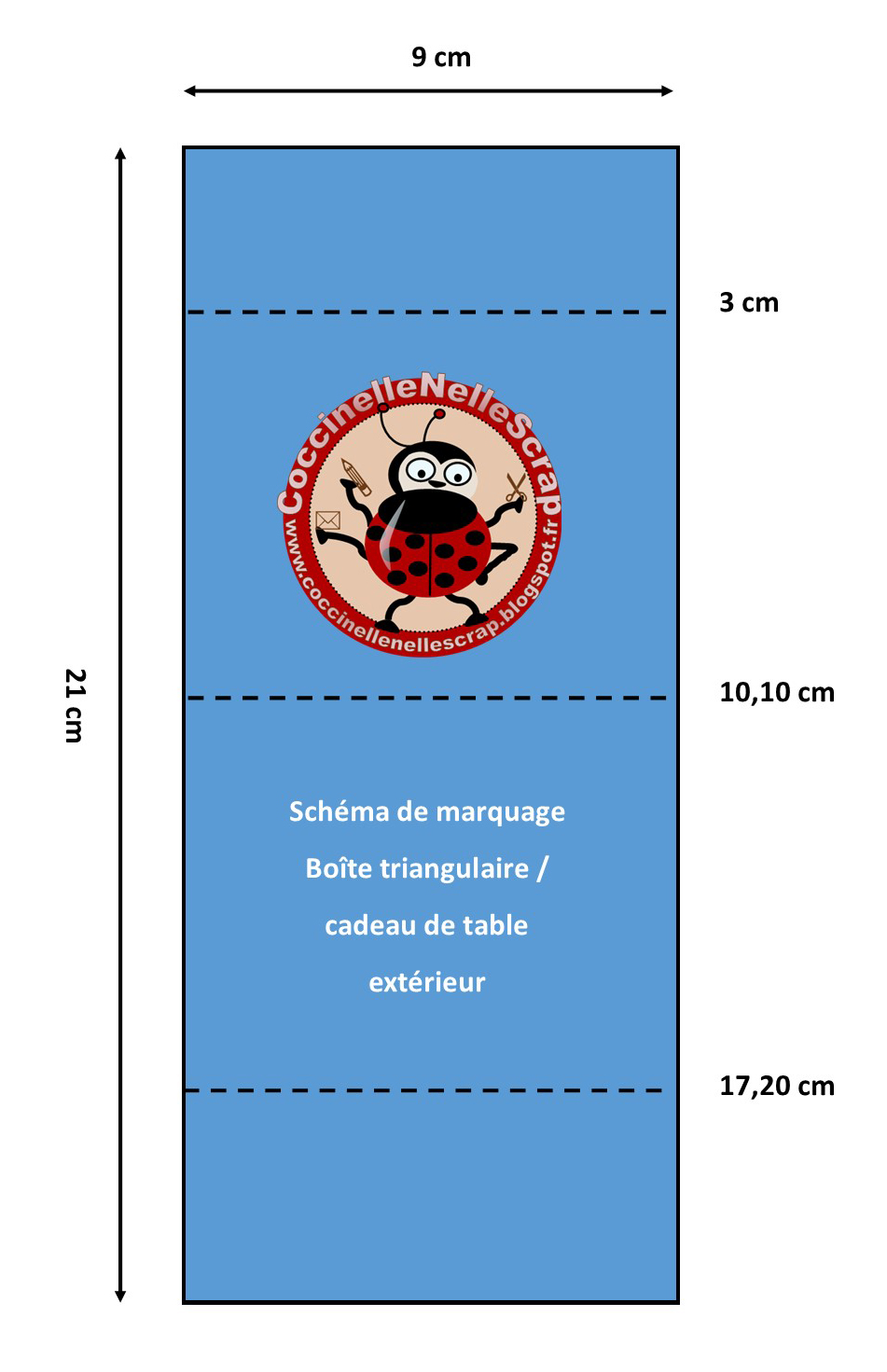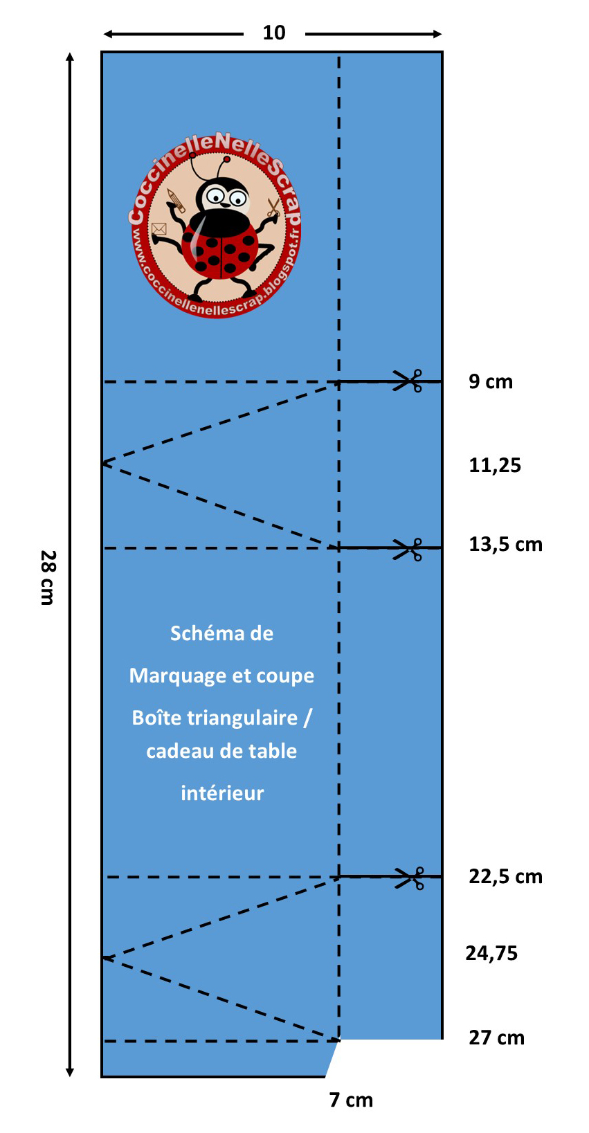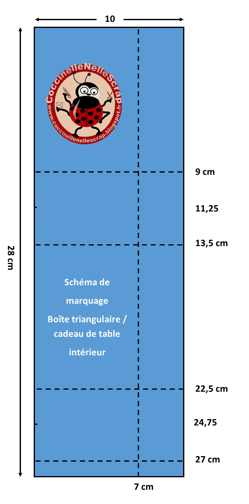 - 1 bande de papier cartonné de 28 x 10 cm, marqué sur la longueur à 9 – 13,5 – 22,5 et 27 cm. Puis marqué sur la largeur à 7 cm. Puis faire un repère sur la longueur à 11,25 et 24,75 cm