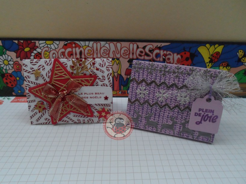 Pour la boîte avec l’étoile, j’ai utilisé du papier cartonné Rouge-Rouge à l’intérieur et Blanc simple pour l’extérieur. Concernant la boîte au décor tricot, j’ai utilisé du papier cartonné Horizon de Bruyère à l’intérieur et Freesia en fleur à l’extérieur. Vous pouvez retrouver, plus bas, l’ensemble des fournitures notamment pour les décorations.
