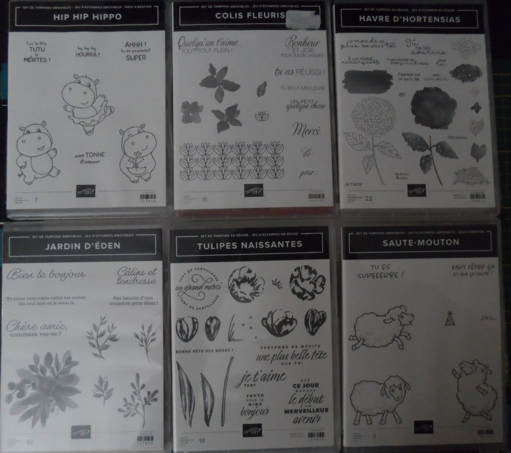 • 2ème lot : 1 ensemble set de tampons + set de poinçons au choix parmi : Jardin d’éden, Tulipes naissantes, Saute-mouton, Hip Hip Hippo, Colis Fleuris, Havre d’hortensias ;
