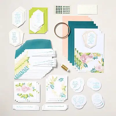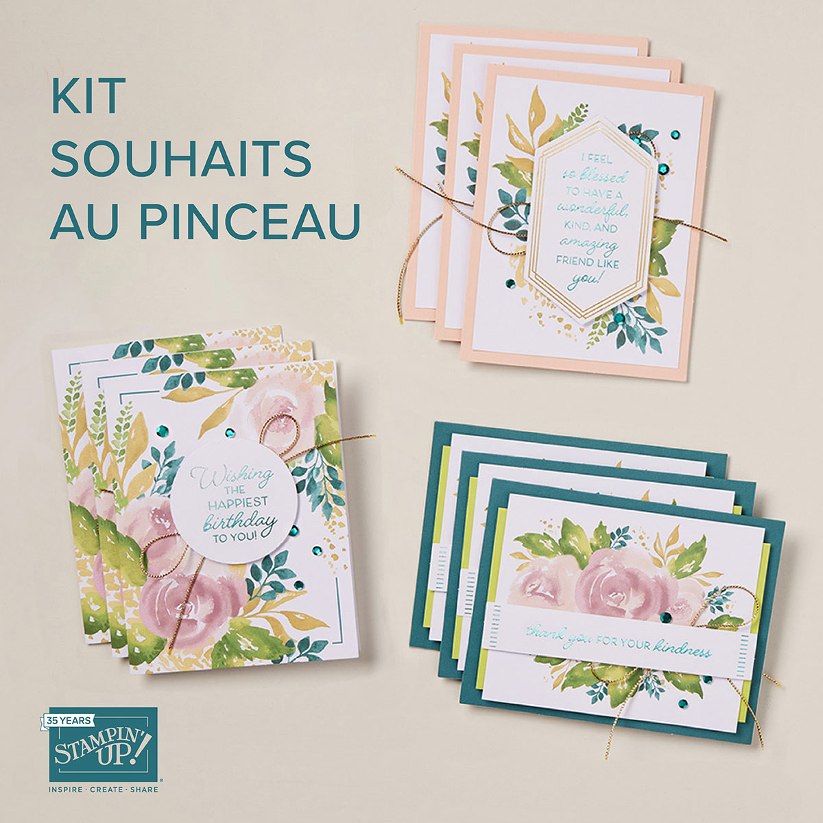 Je vous informe également de l’arrivée d’un nouveau kit dans la collection de kits Stampin’Up! disponibles en ligne. Faites fleurir vos amitiés avec le kit « Souhaits au pinceau ». Il comprend tout le nécessaire pour créer 9 cartes avec un bel effet aquarelle.