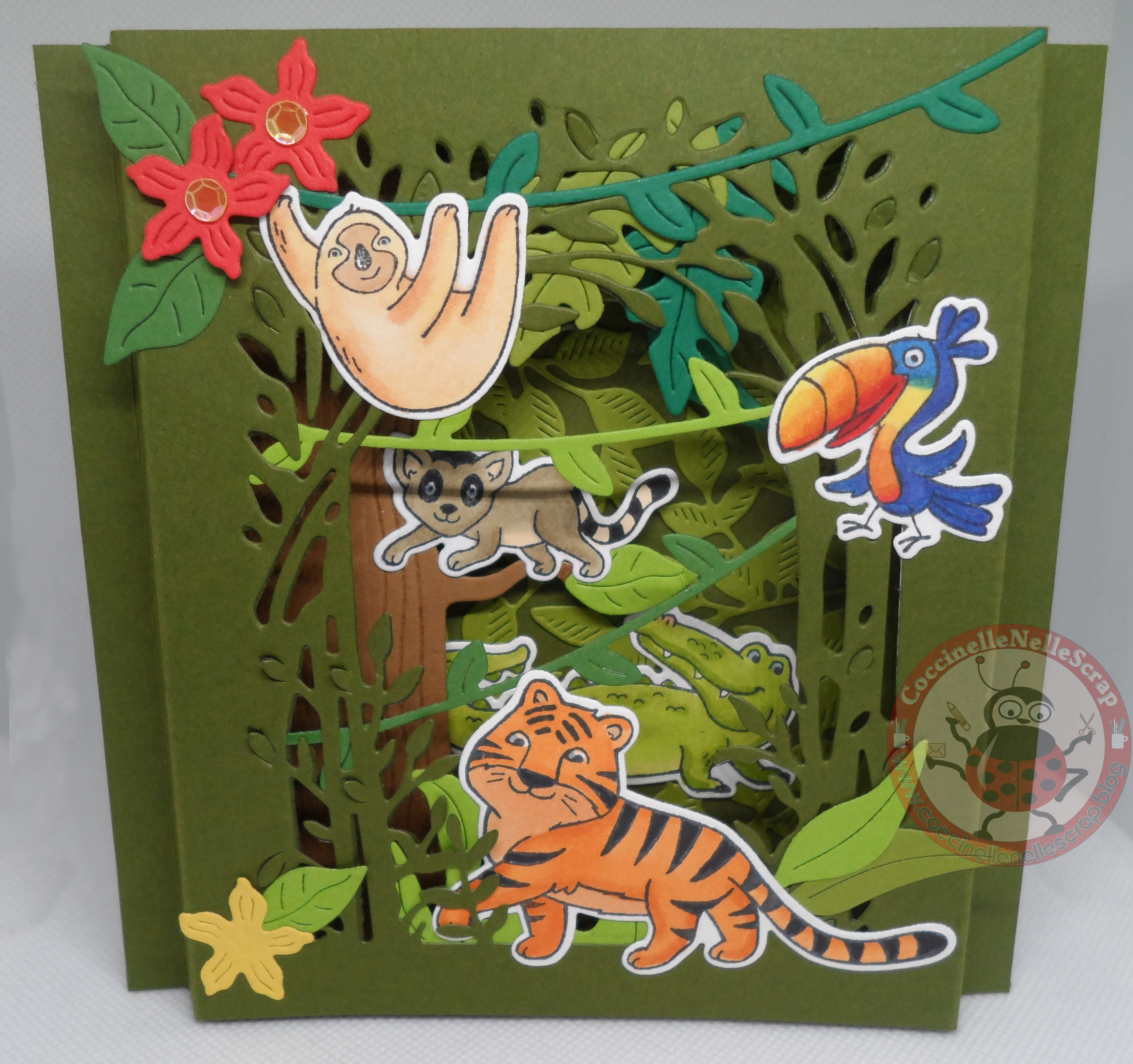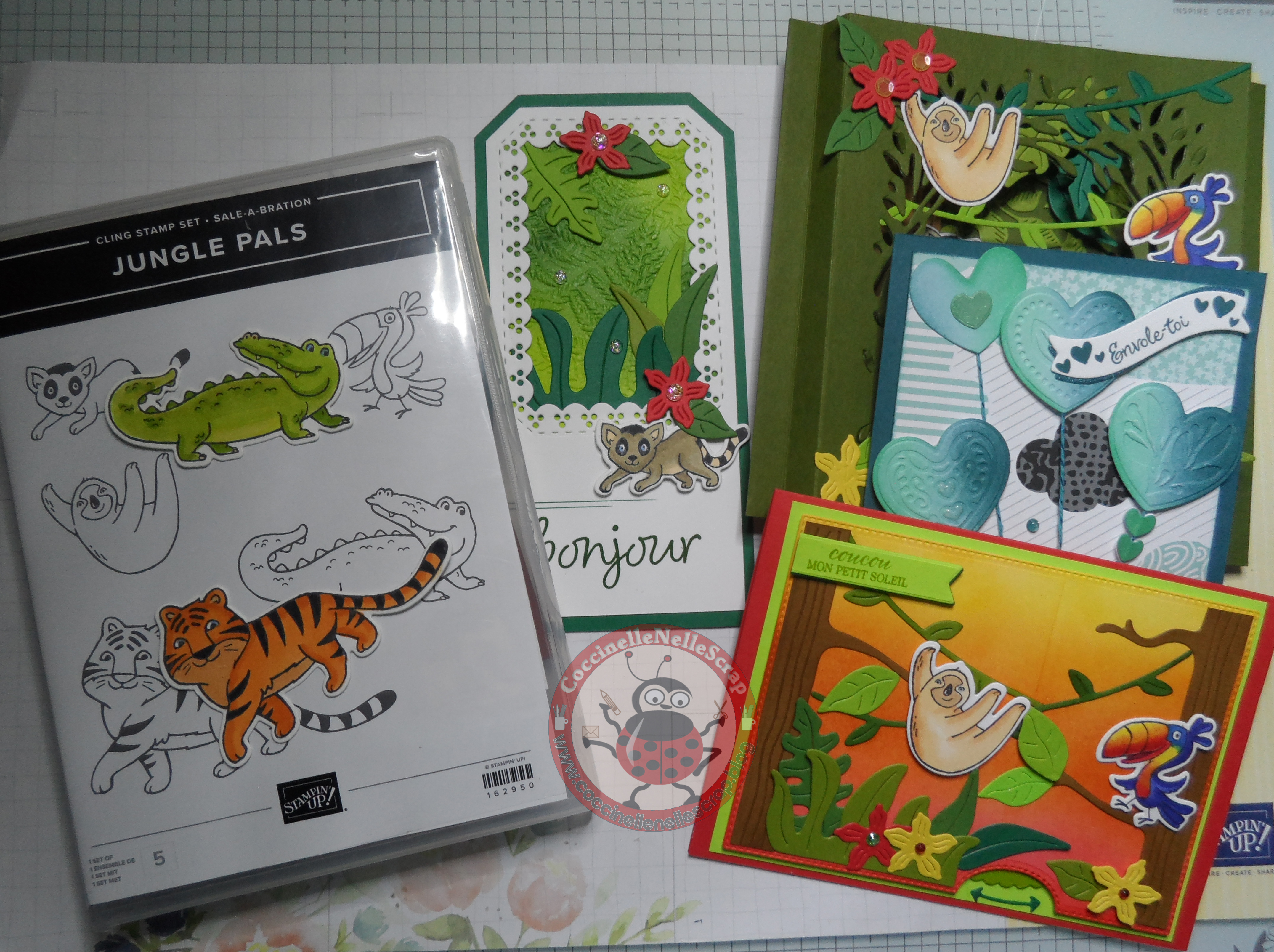 Dès la sortie de la brochure Sale-A-Bration, j’avais dit que je m’amuserai avec le set de tampons Jungle Pals et le set de poinçons Amis de la jungle proposés gratuitement pour toutes commandes de 60€ et 120€.