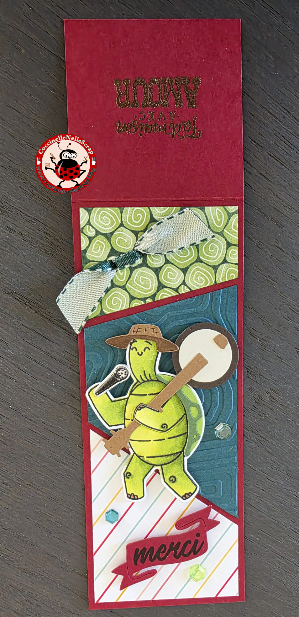 La tortue avec le micro en bas à droite de la première fiche est coloriée avec les Stampin’Blends Grenouille Guillerette clair et foncé, Limonade à la limette clair et Pâtisserie aux pacanes foncé. Elle réunit les découpes du chapeau, du banjo et de la carapace, en plus du micro et de la tortue bien sûr.