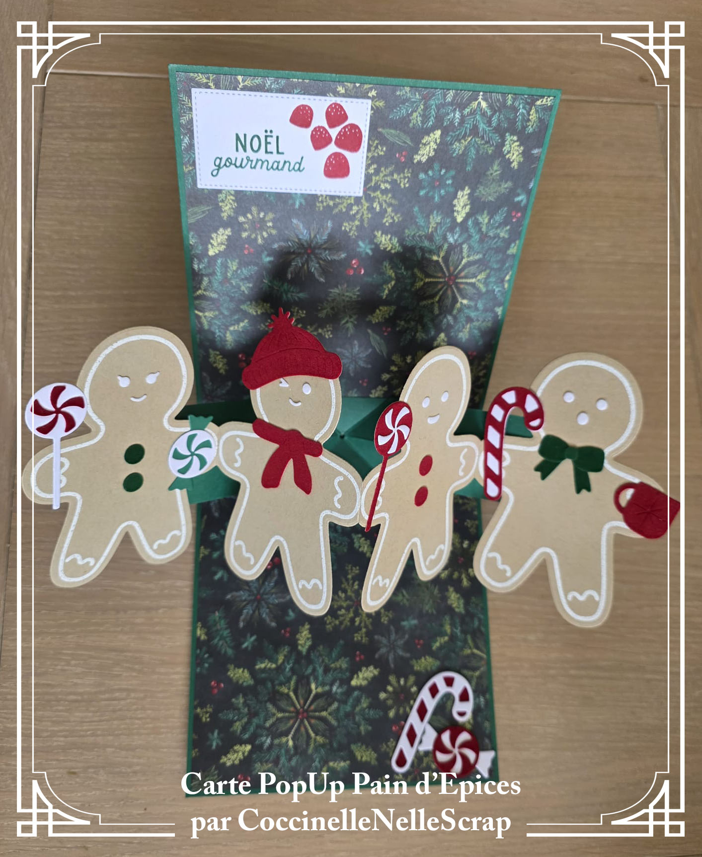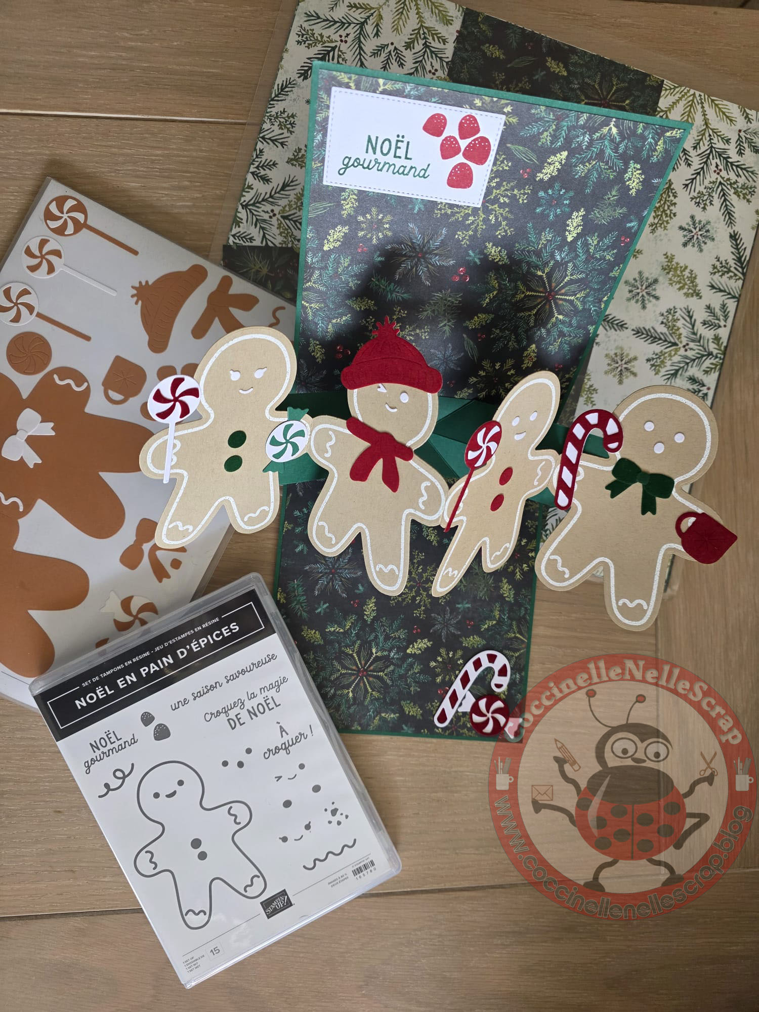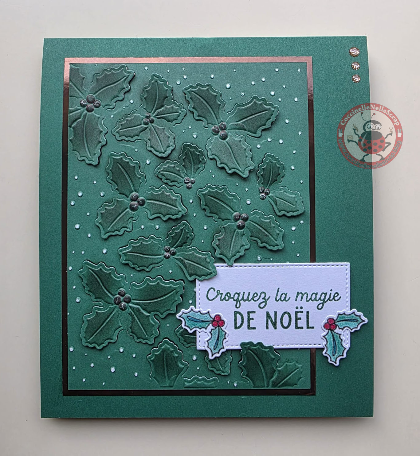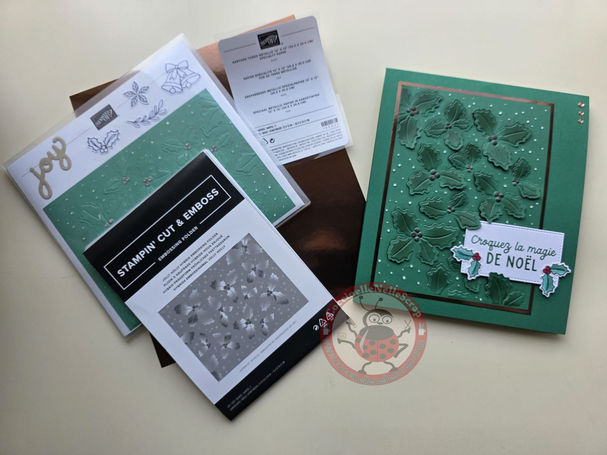 Je l’ai confectionnée avec le lot Noël en pain d’épices, réf. 165786, du nouveau mini-catalogue, le plioir à gaufrage hybride Houx enjoué, réf. 166119 (une exclusivité en ligne parue en Juillet 2025), et de nouveaux papiers : le papier design Flocons de pin élégants, réf. 166066, le papier métallisé Ton de Terre, réf. 165901, et le papier spécialité Velours de toute saison, réf. 166063.