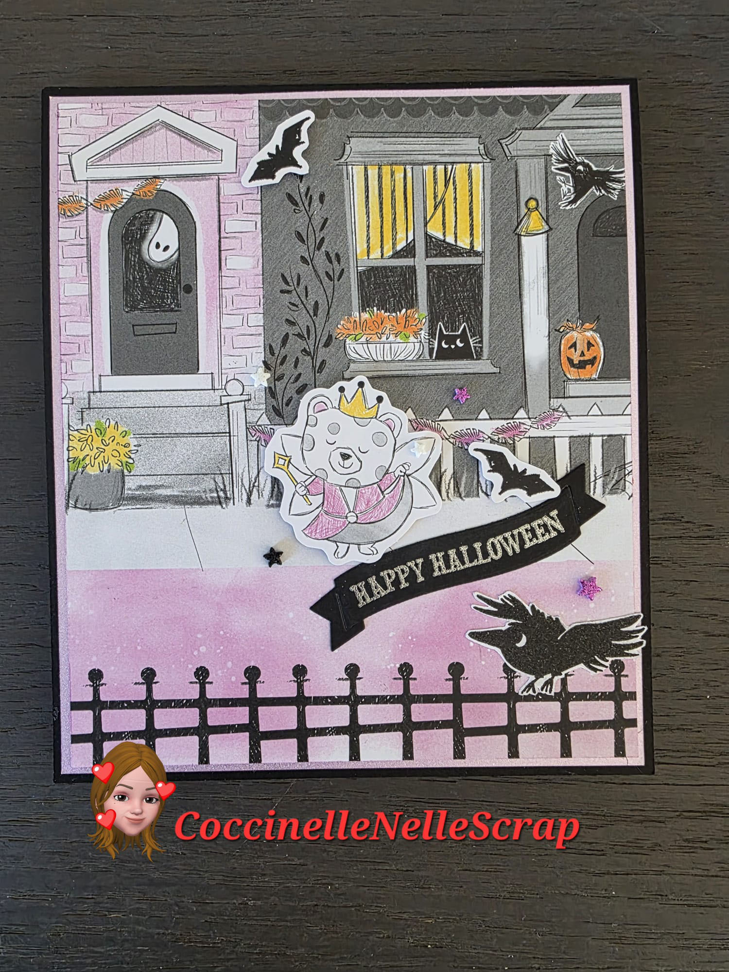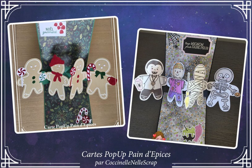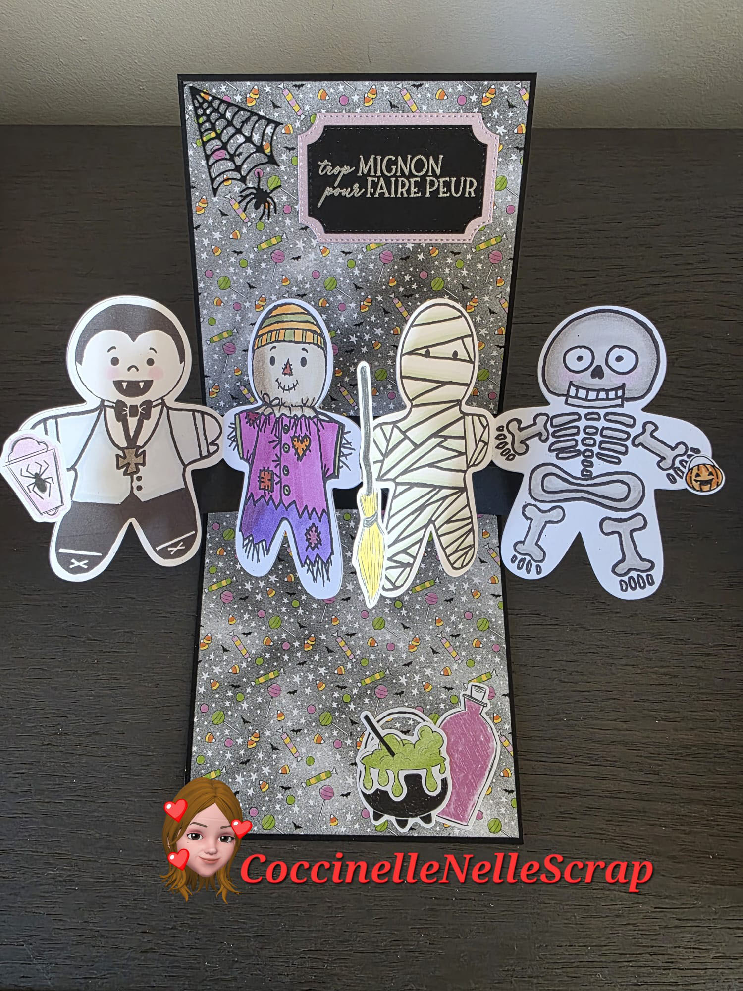 Mais je me suis également beaucoup amusée en la réalisant dans une version Halloween avec les magnifiques papiers design « Même pas peur », en m’inspirant pour les personnages, de l’ancien set de tampons Cookie-Cutter Halloween.