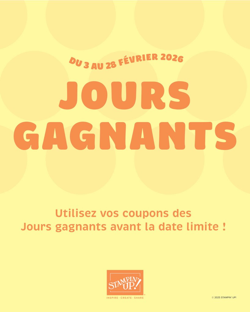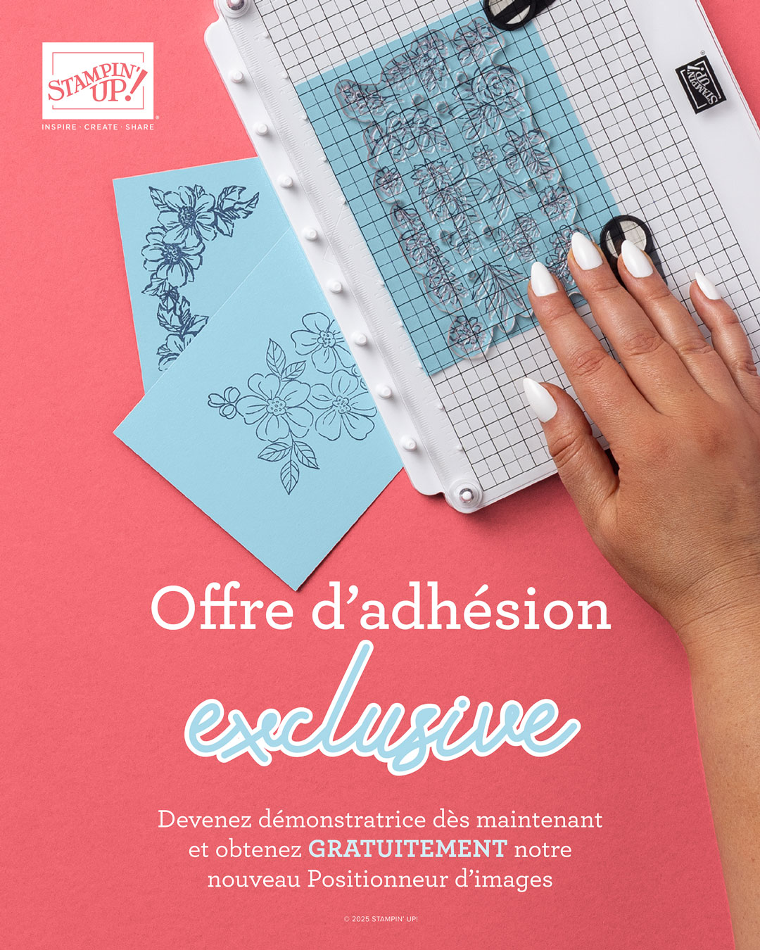 En rejoignant mon équipe entre le 3 février au 2 mars 2026, vous obtiendrez gratuitement le nouveau positionneur d’images d’une valeur de 60€ avec vos fournitures de lancement. Pour cela, devenez démonstratrice Stampin’Up! et profiter de tous les avantages qui y sont associés, notamment 20-25 % de réduction sur les produits, un accès anticipé aux nouveautés, l’occasion de gagner un complément de revenu modeste, la chance de participer à des événements créatifs et de formation et plus encore ! C’est vous qui, parmi tous les catalogues en cours mais aussi les exclusivités en ligne, choisissez votre kit de lancement d’une valeur de 175€ que vous ne payerez que 129€, soit une économie de 106€. Elle est pas belle la vie avec Stampin’Up!