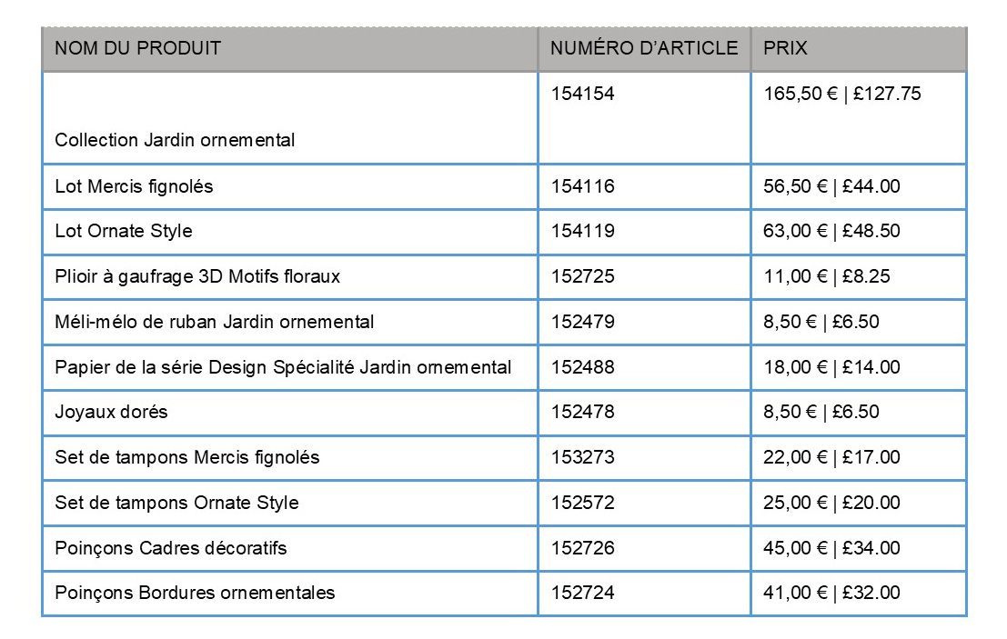 Je vous la présente sur la vidéo ci-dessous et retrouvez les références et le prix de chacun des articles qui la composent dans le tableau suivant. La Collection Jardin Ornemental, réf. 154154, comprend tous les articles.