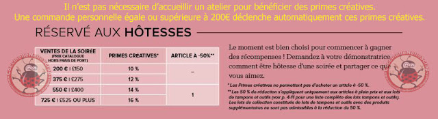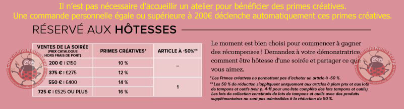 Ces primes créatives vous permettent de vous offrir dans les catalogues en cours, les produits qui vous plaisent. C’est vous qui faites votre choix à hauteur de la somme obtenue en primes créatives. Par exemple, vous passez une commande de 210€, vous bénéficierez de 21€ de primes créatives et pourrez vous offrir notamment un set de tampons de cette valeur (voire de 2 ou 3€ de plus mais dans ce cas, ils seront ajoutés au montant de votre commande).