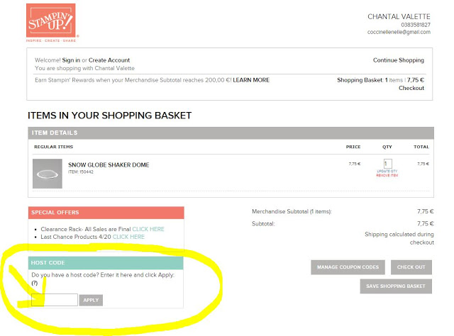 Pour toute commande de moins de 200€, n\’oubliez pas d\’ajouter le code hôtesse en cours (actuellement : 3CUFUKZX) en bas à gauche de votre panier (voir image ci-dessous) afin que je puisse vous adresser mon petit cadeau de remerciement.