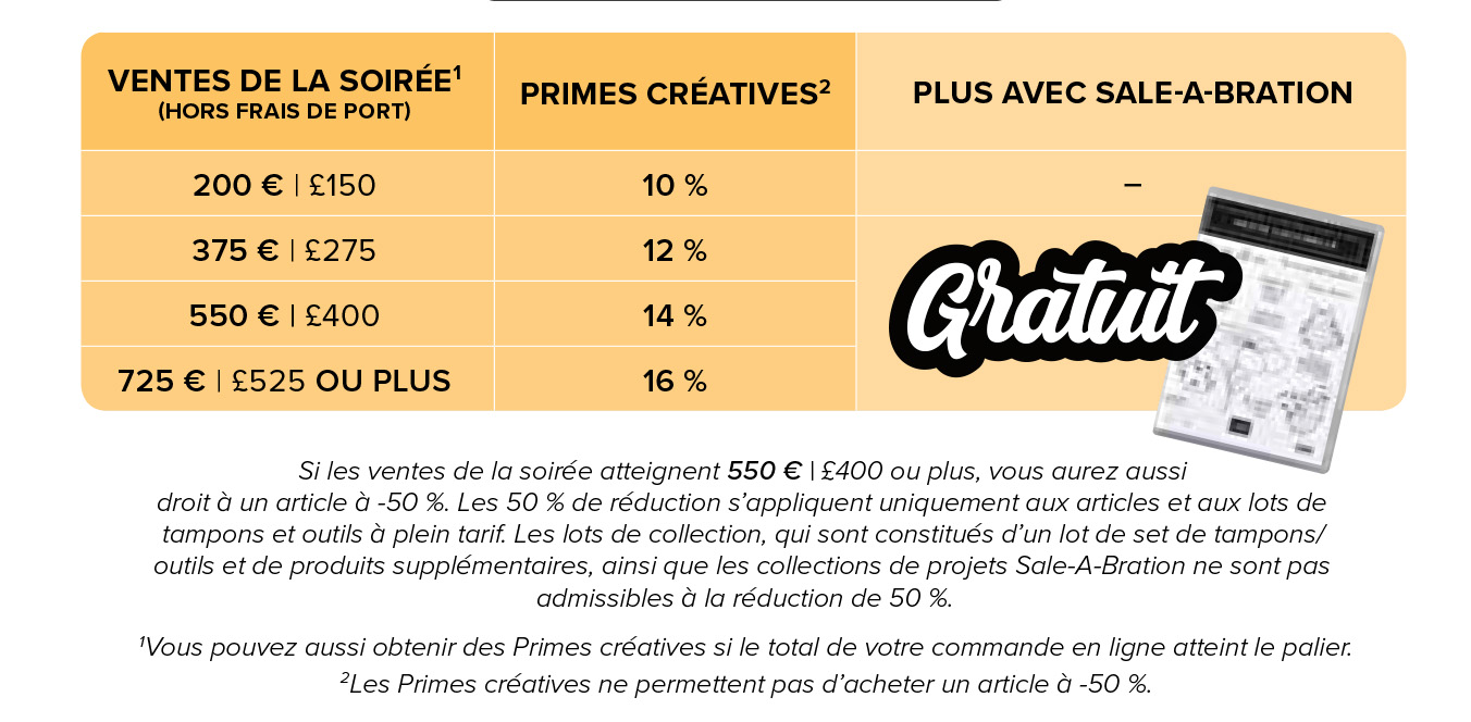 Durant cette période, il vous est possible de choisir un ou des produits exclusifs de la brochure Sale-A-Bration pour chaque commande par tranche de 60€ (hors frais de port), soit une commande de 60€ = 1 produit à choisir dans la brochure Sale-A-Bration, une commande de 120€ = 2 produits à choisir dans la brochure Sale-A-Bration, une commande de 180€ = 3 produits à choisir dans la brochure Sale-A-Bration, etc…