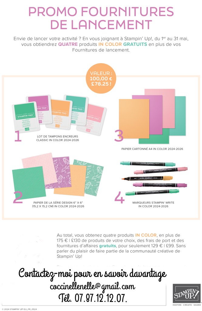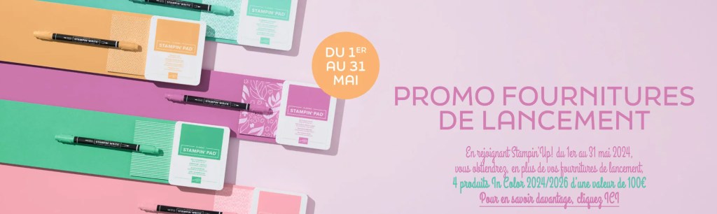 Bonne nouvelle ! Du 1er au 31 mai, les personnes qui deviennent démonstratrice Stampin’Up! obtiendront quatre produits In Color 2024-2026 GRATUITS dans leurs Fournitures de lancement !