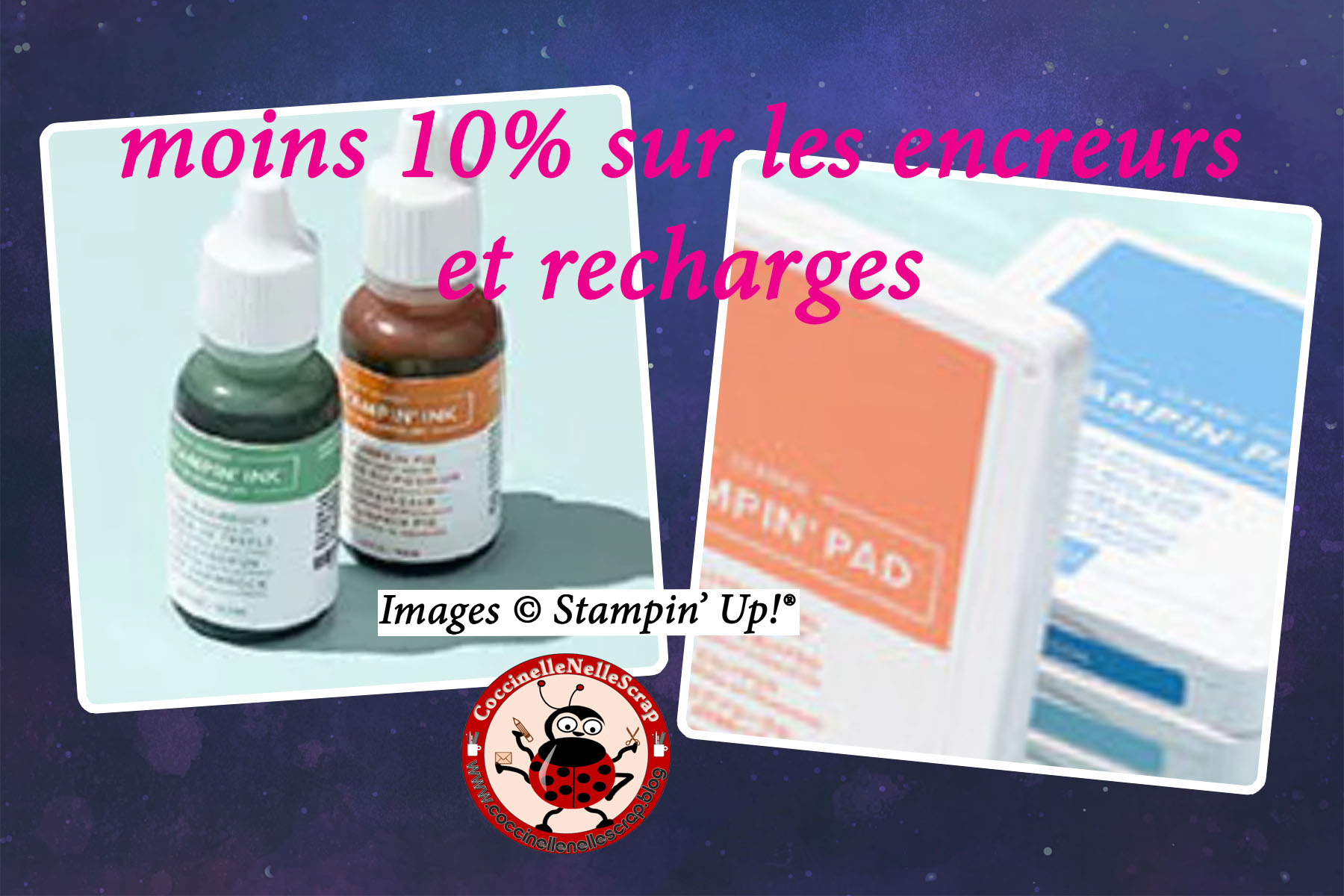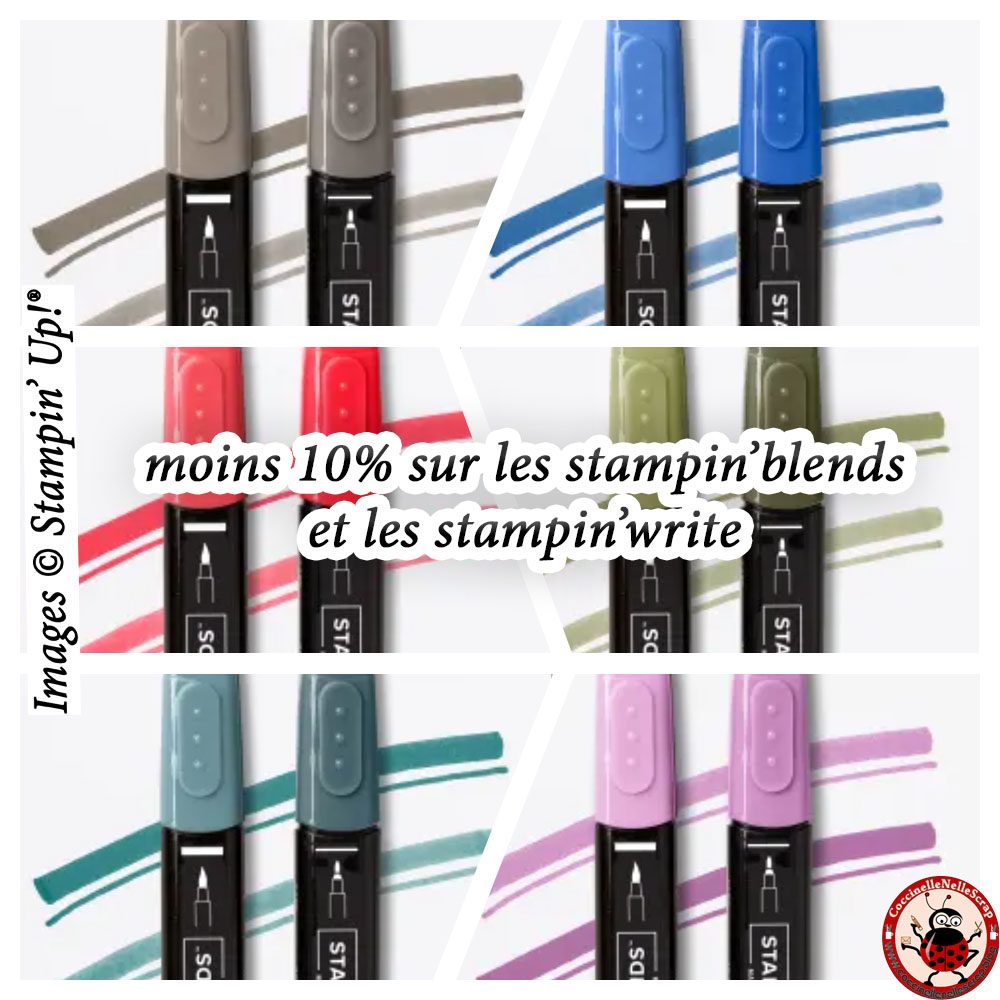 - moins 10 % sur l’encre, y compris les tampons encreurs, les recharges, les marqueurs Stampin’ Write et les marqueurs Stampin’ Blends. La promotion ne s’applique pas sur les lots de tampons encreurs et les tampons encreurs d’autres marques.