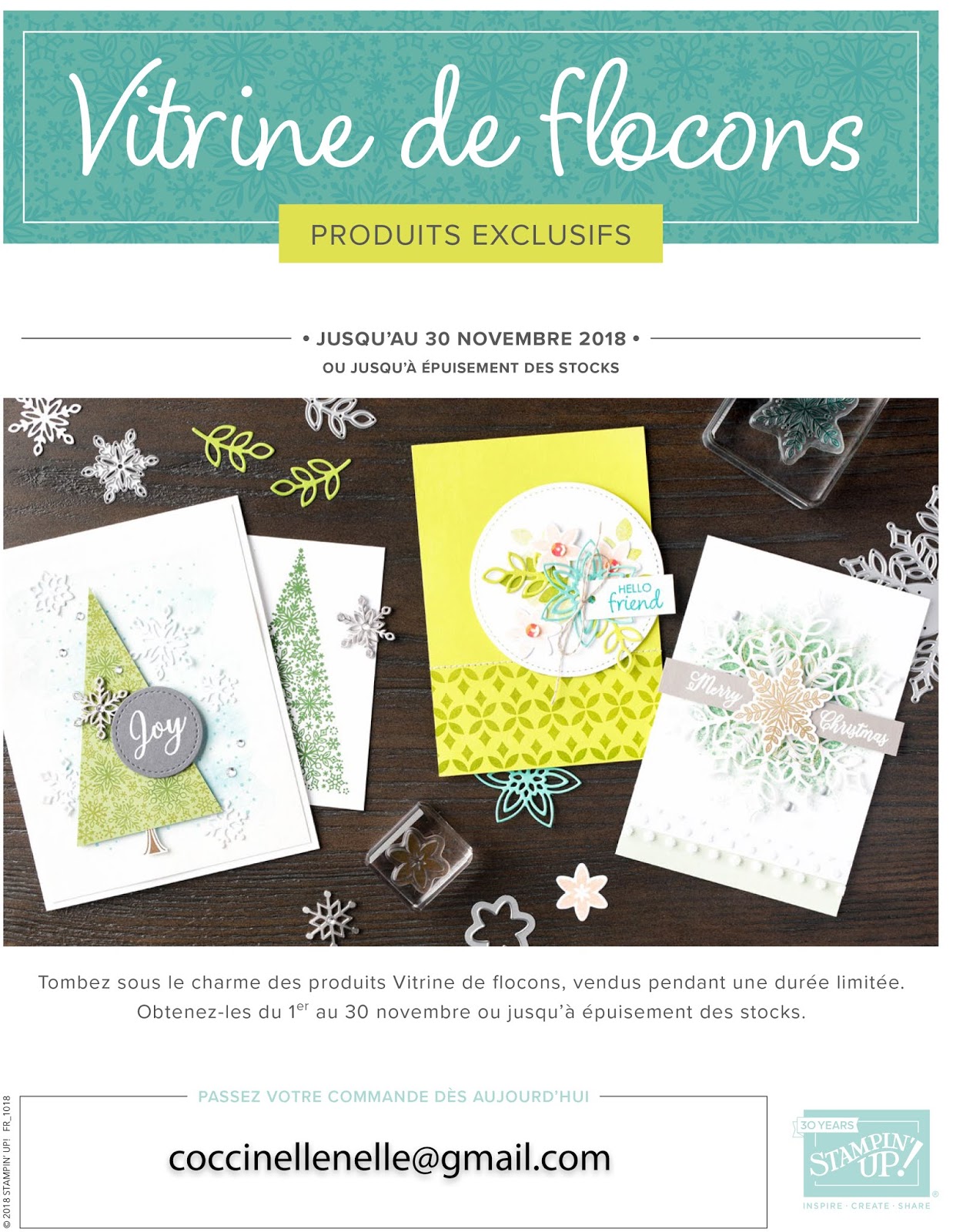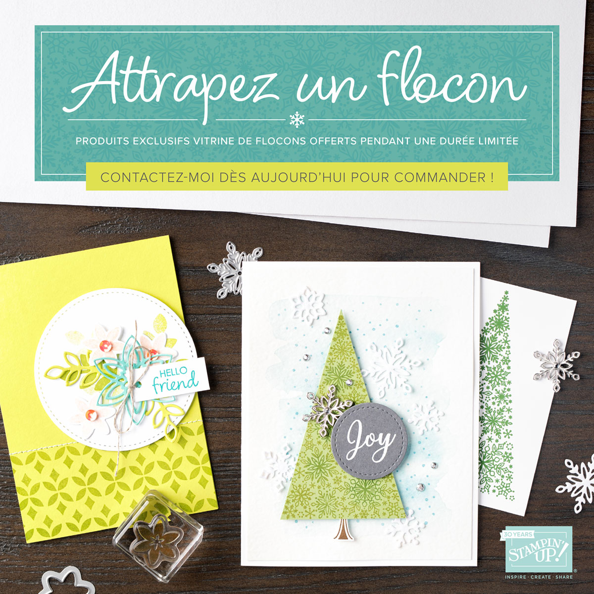 Je vous présente la \ »Vitrine de Flocons\ » Stampin\’Up! dont les produits exclusifs sont en vente pendant une durée limitée du 1er au 30 novembre ou jusqu\’à épuisement des stocks.